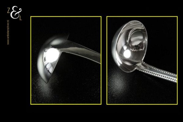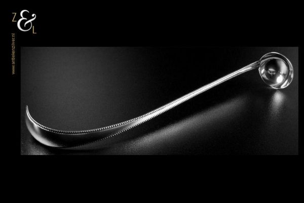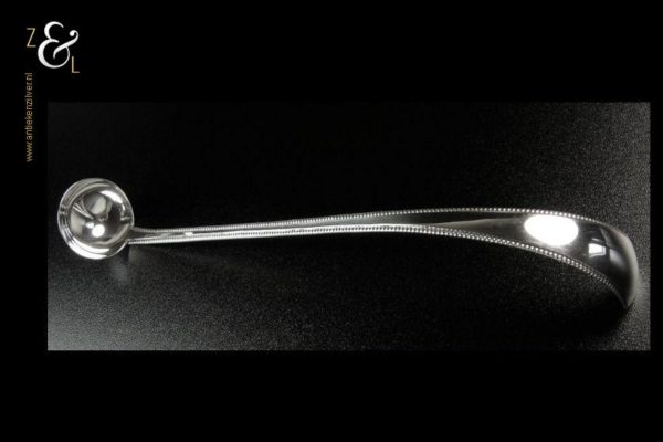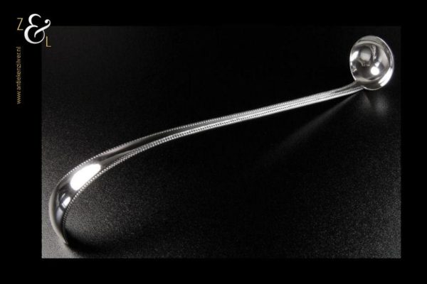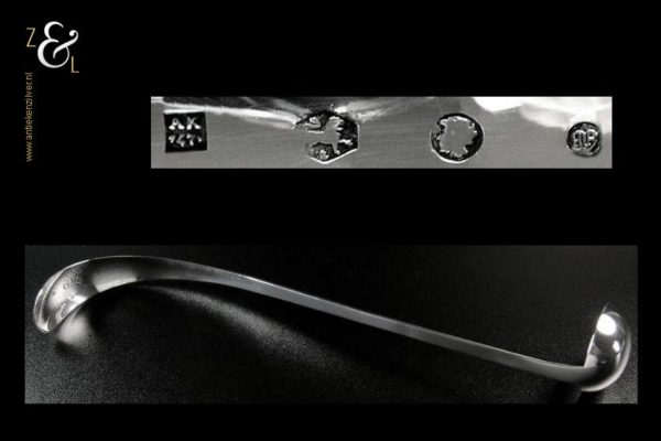 Boerenjongenslepel gemaakt in Schoonhoven door Jan Boon (meesterteken AK boven +47+ in vierkant) in het jaar 1896 (jaarletter M). Deze zilveren boerenjongenslepel met parelrand die tot aan de bak doorloopt weegt 49 gram en is 25.5 cm lang de diameter van de bak is 3.9 cm.
