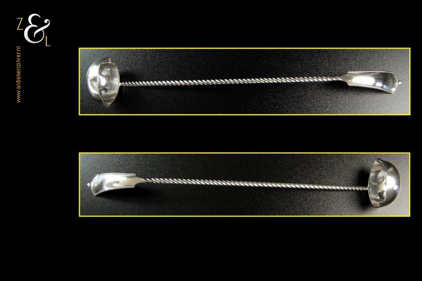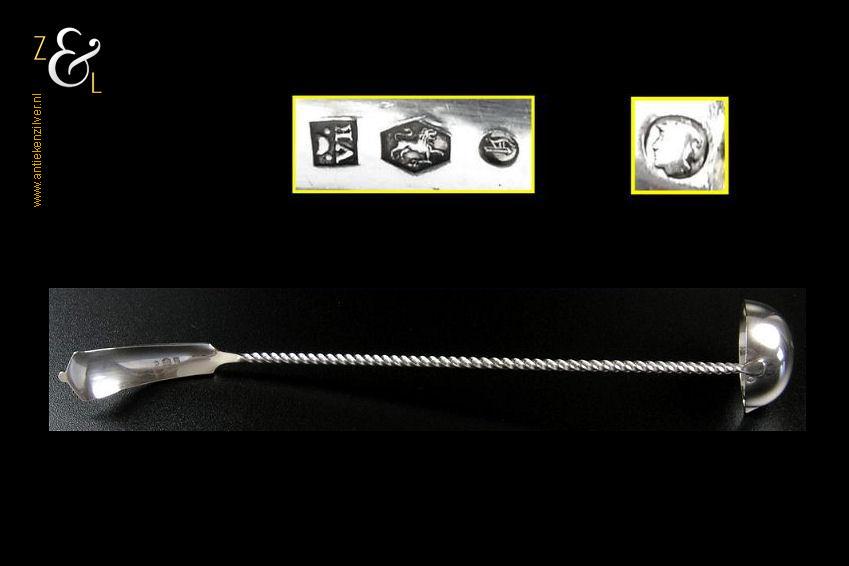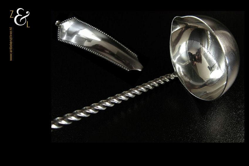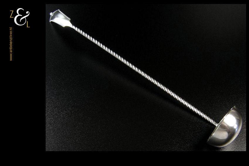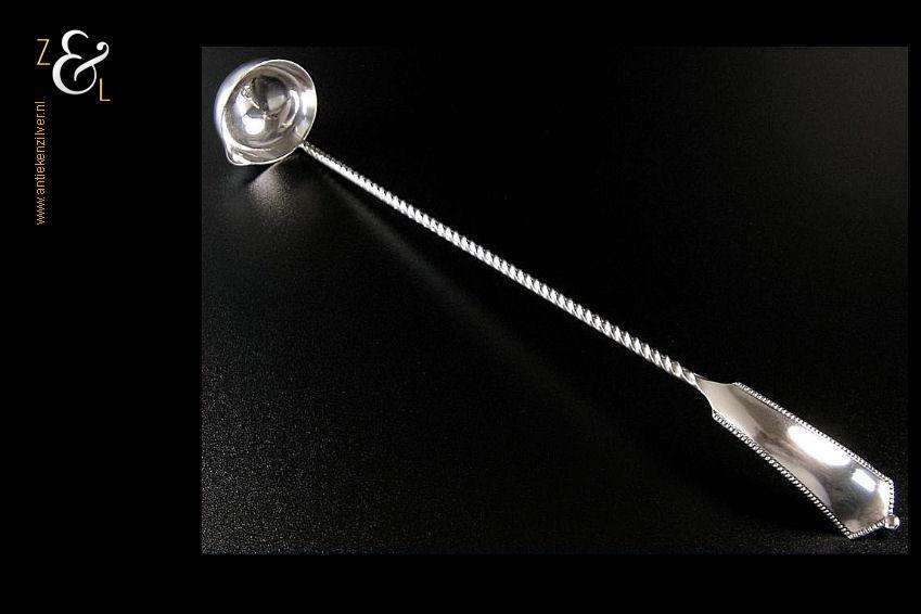 Bowllepel gemaakt in Voorschoten door de Fa. J.M. van Kempen & Zonen (meesterteken liggend maantje tussen punten boven VK in vierkant) in het jaar 1892 ( jaarletter H ). Deze zware zilveren bowllepel met getordeerde steel en handvat met parelrand weegt 76 gram is 31.3 cm lang en de diameter van de bak (met schenktuit) meet 4.8 cm.