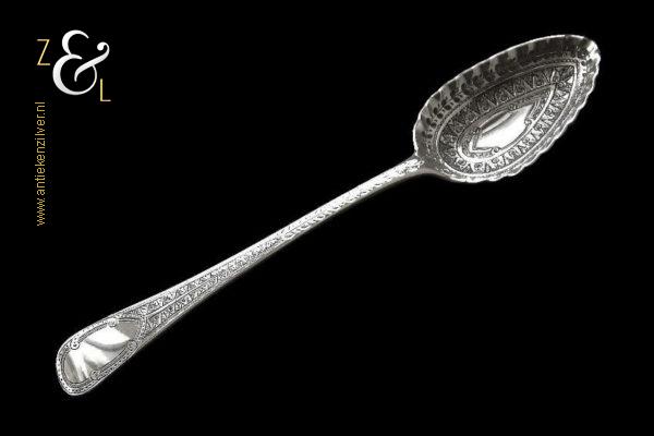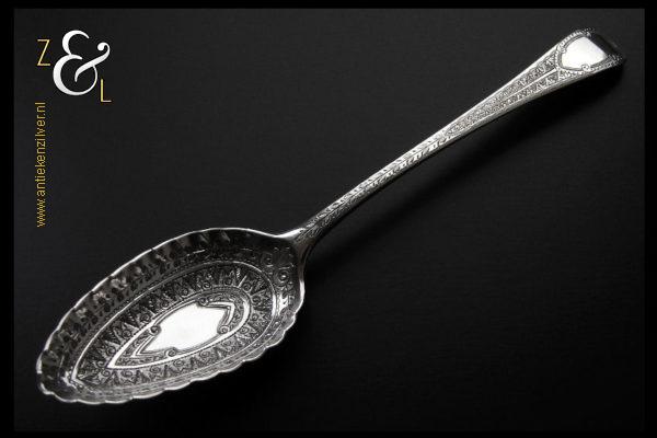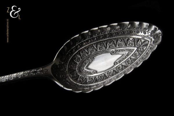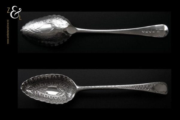 Deze compotelepel (bessenlepel / berryspoon) is oorspronkelijk zijn leven begonnen als diner- of dienlepel en later in de Victoriaanse periode die liep van 1837 tot 1901 uitgevoerd met het huidige fraaie graveer- en drijfwerk. De Victorianen stonden er bekend om, om antiek zilver uit vroegere periodes naar hun smaak aan te passen. Deze compotelepel (bessenlepel / berryspoon) is daar een goed voorbeeld van.