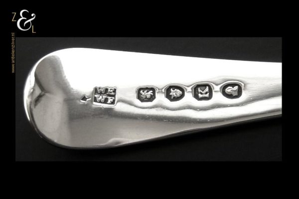 Deze handgesmede geheel gegraveerde en bewerkte compotelepel (bessenlepel / berryspoon) is gemaakt in Londen Engeland door de zilversmeden William Eley & William Fearn (meesterteken WE boven WF in vierkant) in het jaar 1805 (jaarletter K). Tevens is deze 1e gehalte Sterling zilveren lepel gestempeld met het belastingkeur George IV, het gekroonde luipaardhoofd (voor Londen) en met de lopende leeuw (zilvergehalte). De compotelepel weegt 64 gram en is 21.7 cm lang. De lepelbak is 7.9 cm lang bij 4.6 breed.