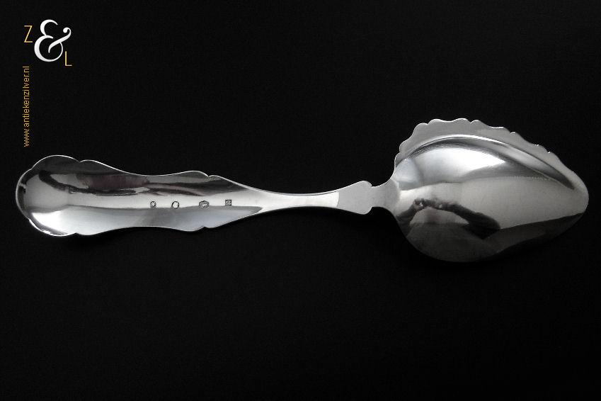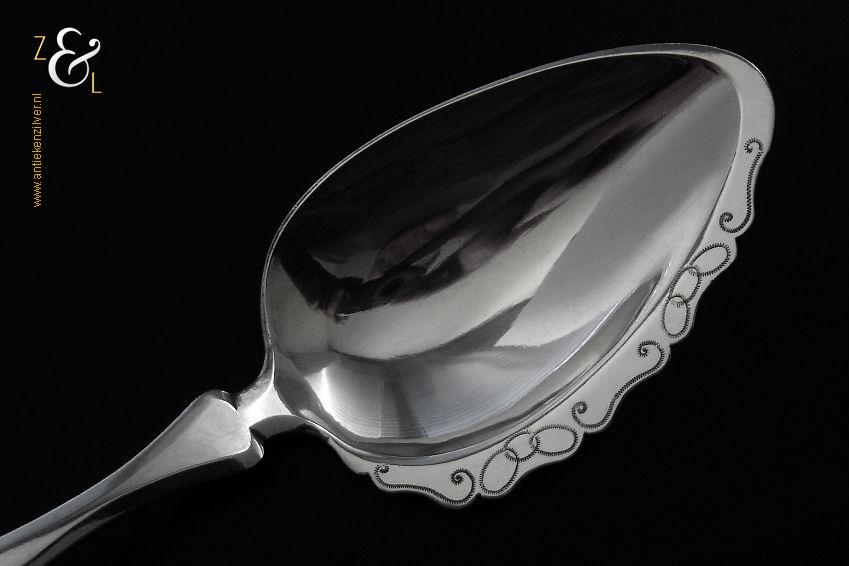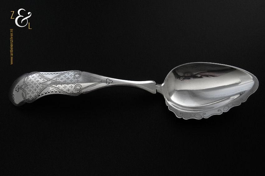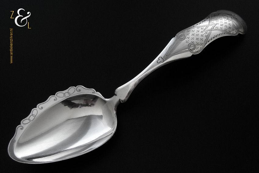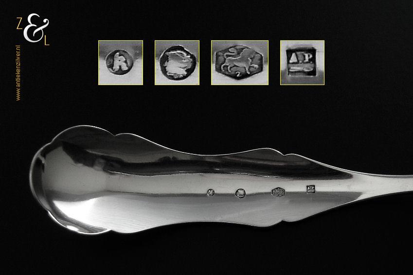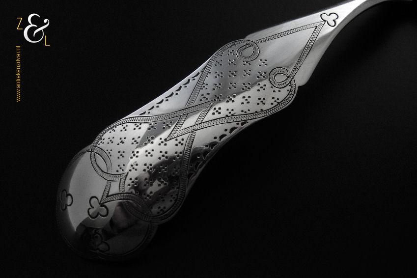 Deze compotelepel is gemaakt in Schoonhoven door Arie de Pater (meesterteken A.P. boven lepel in vierkant) in het jaar 1869 (jaarletter K). De zilveren Biedermeier compotelepel die fijntjes gegraveerd is weegt 51 gram en is 21.8 cm lang. De lepelbak is 8 cm lang bij 5.2 cm breed.