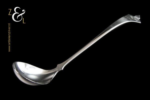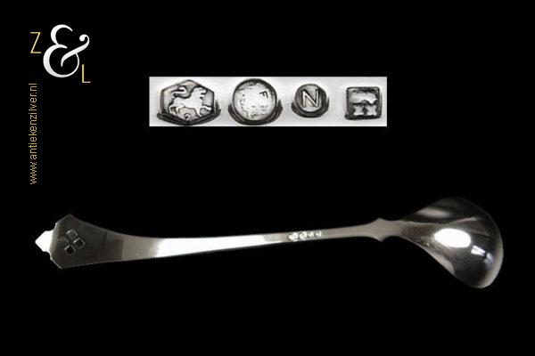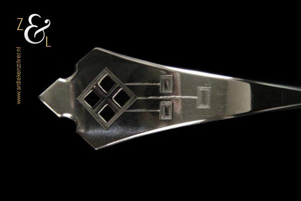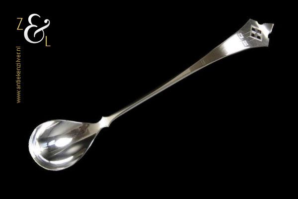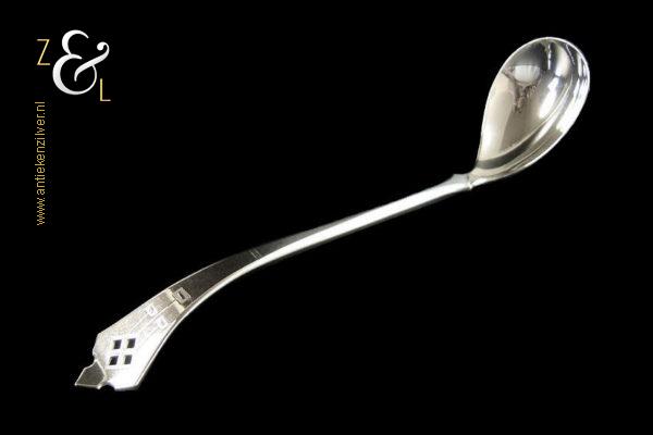 Deze compotelepel is gemaakt in Leeuwarden Friesland door R.W. Kijlstra (meesterteken RK boven ster in vierkant) in het jaar 1923 (jaarletter N). De met een gematteerde steel (matteren is een bewerking waarbij de zilversmid het oppervlak van een zilveren voorwerp een matte structuur geeft) en geometrisch uitgezaagde en gegraveerde zilveren Art Deco lepel weegt 63 gram en is 24 cm lang. De lepelbak is 6 cm lang bij 4.4 cm breed. Het meesterteken is moeilijk leesbaar.