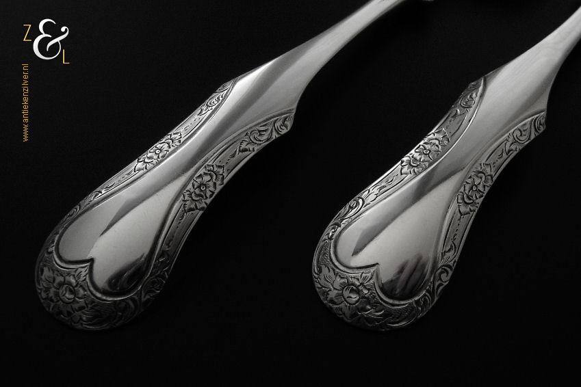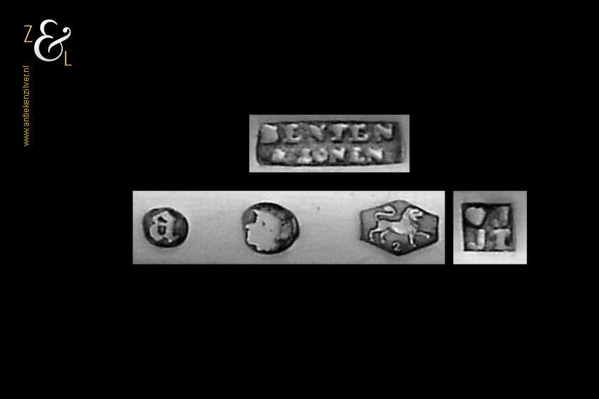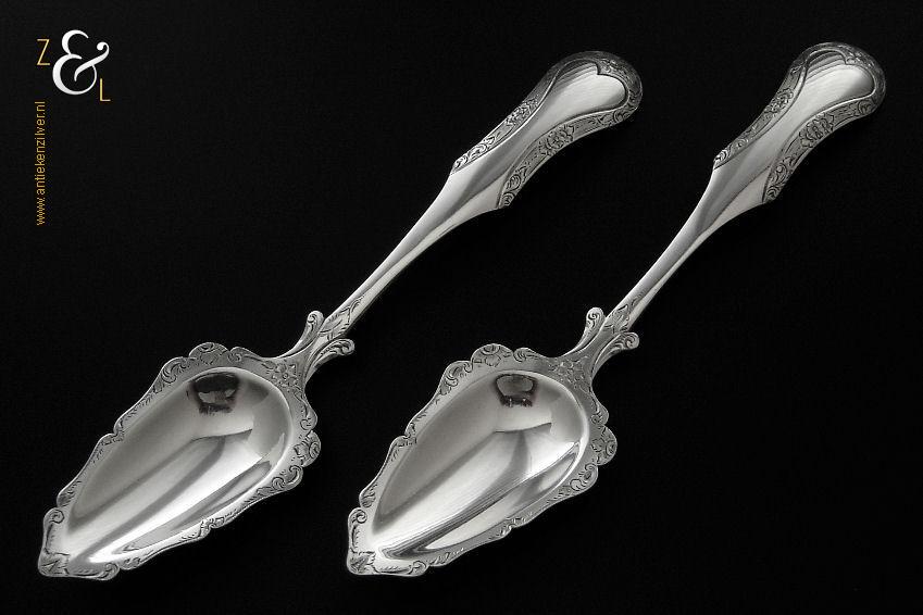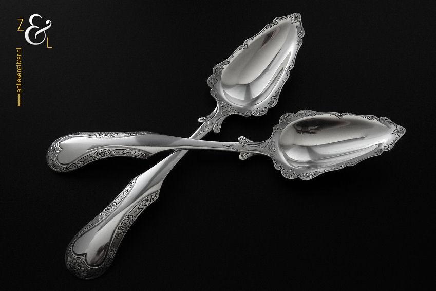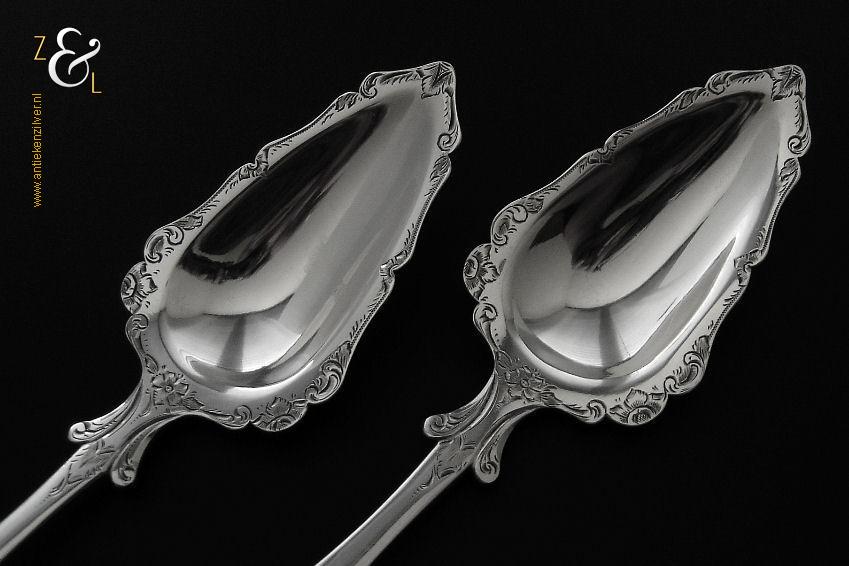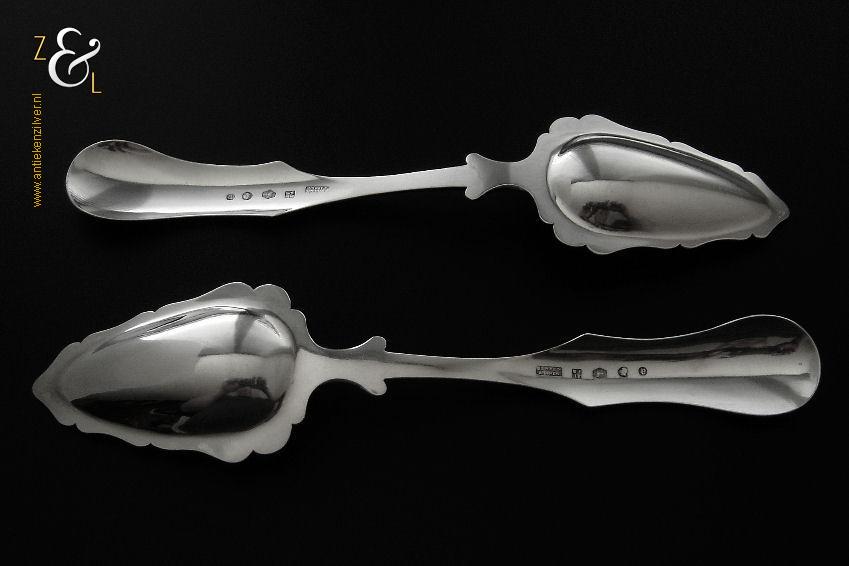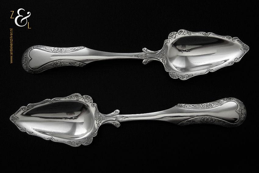 Dit stel compotelepels is gemaakt in Amsterdam door Johannes Jacobus Torlau (meesterteken hartje J boven J T in vierkant) in het jaar 1860 (jaarletter A). Tevens draagt dit stel compotelepels het winkeliersmerk van Benten & Zonen. De zilveren Biedermeier compotelepels hebben een diepe gravering van c-vormige voluten en bloemmotieven. De stelen zijn gegraveerd met een hartmotief. De compotelepels wegen samen 82 gram en zijn 20.8 cm lang. De lepelbakken zijn 7.6 cm lang bij 4.6 cm breed.