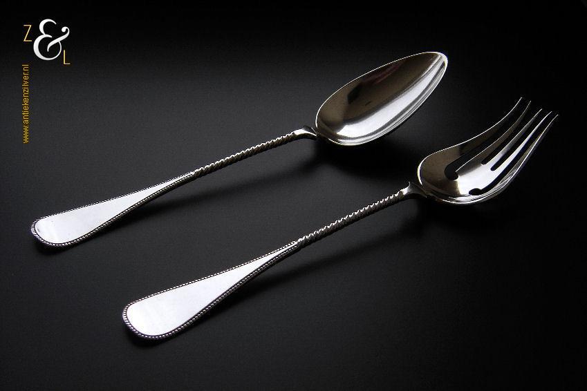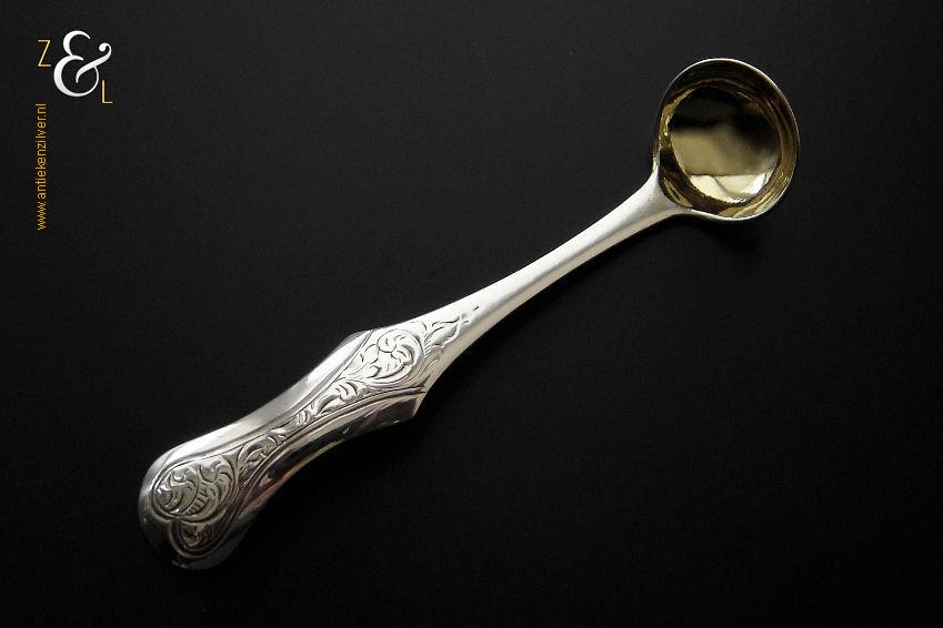 Dienlepel gemaakt in Amsterdam door wed. H. Helweg & Zn. (meesterteken WHH&Z onder anker in rechthoek) in het jaar 1876 (jaarletter R). Deze in eerste gehalte zilver uitgevoerde zware dienlepel van zéér hoge kwaliteit is uitgevoerd in spatel dubbelrondfilet. De dienlepel weegt 162 gram en is 27 cm lang. De lepelbak meet 10 cm bij 5.7 cm. Aan de achterkant van de spatel zijn twee wapens gegraveerd met daarboven een Gravenkroon.