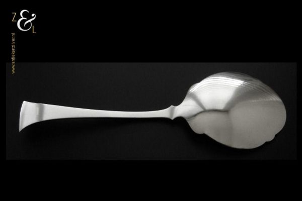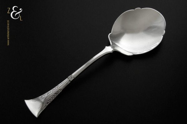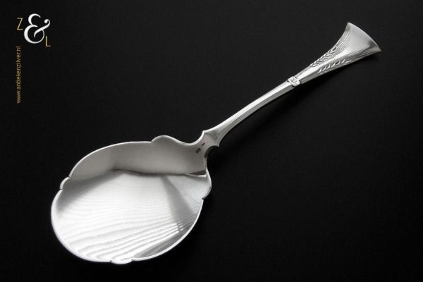 Deze dienlepel is gemaakt in Schoonhoven door Gerrit Regtdoorzee Greup (meesterteken GG in rechthoek) tussen 1888 en 1905 (gekeurd met het zilverkeur zwaardje). De zilveren Jugendstil dienlepel waarvan het uiteinde van de steel gegraveerd is met korenaren weegt 50 gram en is 19.1 cm lang. Het schepgedeelte is 7.5 cm lang bij 6.1 cm breed.