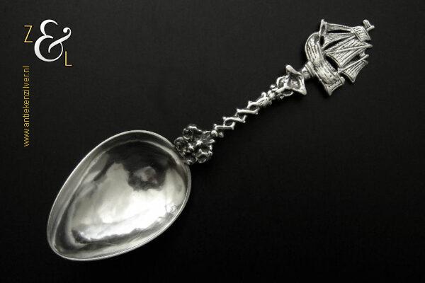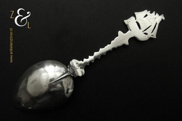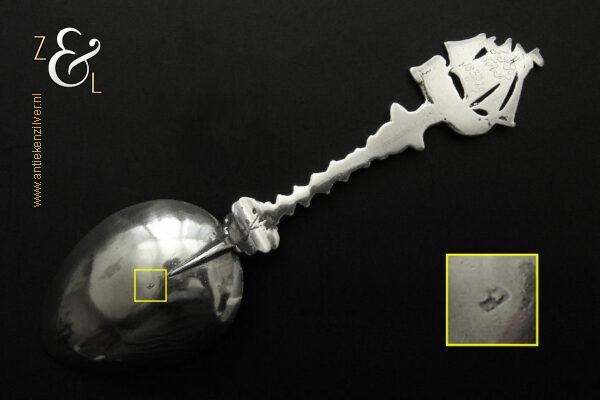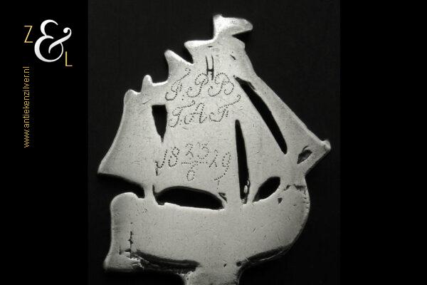 Geboortelepel / gelegenheidslepel gemaakt in Sneek provincie Friesland door Petrus Rienstra (meesterteken PR in rechthoek) in het jaar 1828 (jaarletter F). De steel van deze zilveren geboortelepel / gelegenheidslepel is bekroond met een zeilschip. De geboortelepel / gelegenheidslepel heeft in de lepelbak de zilverkeuren voor 2e gehalte zilver en het kantoorstempel van Leeuwarden. Op de achterzijde van de lepelbak zit een gedeeltelijk zichtbaar (weggepoetst) meesterteken. De geboortelepel / gelegenheidslepel heeft aan de achterzijde van het zeilschip een stippelgravering met F.P.B met daaronder T.A.F met daaronder de cijfers 18 23 6 29 (23 juni 1829). De geboortelepel / gelegenheidslepel weegt 53 gram en is 18.1 cm lang, de lepelbak meet 7 cm bij 4.8 cm.