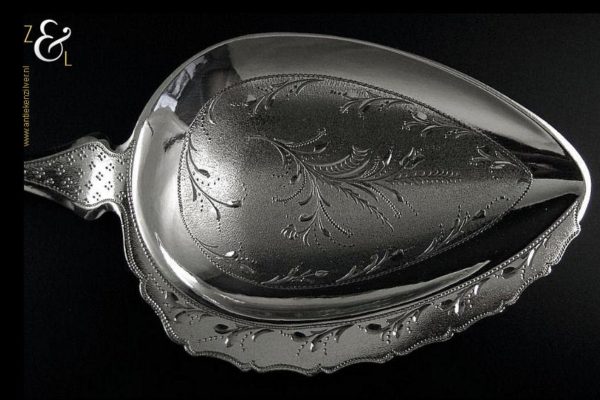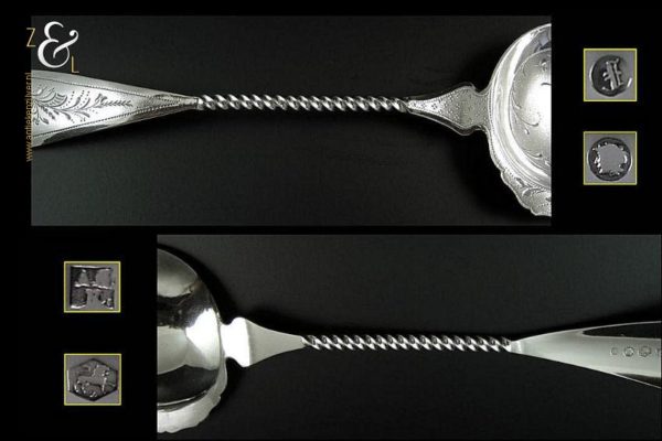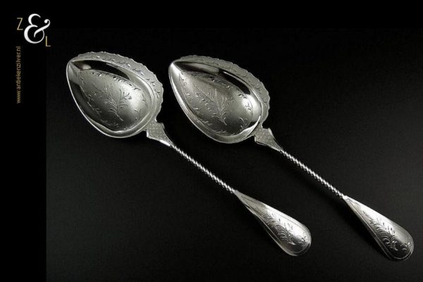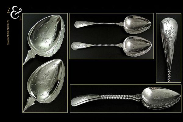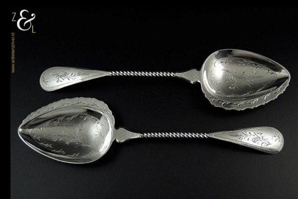 Dit stel groentelepels is gemaakt in Schoonhoven door Adrianus Andries Graves Kooiman (meesterteken A.G. boven K. in vierkant) in het jaar 1890 (jaarletter F). De zilveren Jugendstil groentelepels zijn fijntjes gegraveerd en hebben getordeerde stelen. De handvatten en lepelbakken zijn zowel in gematteerd als hoogglans uitgevoerd. De groentelepels wegen samen 102 gram en zijn 23.5 cm lang. De lepelbakken zijn 8.4 cm lang bij 6 cm breed.