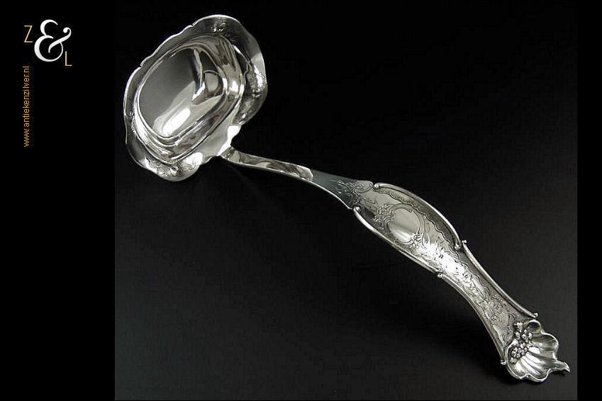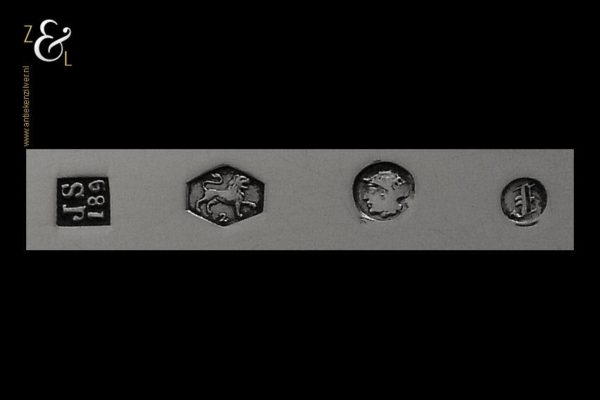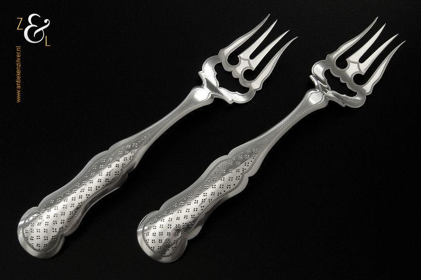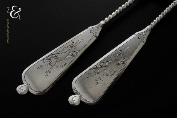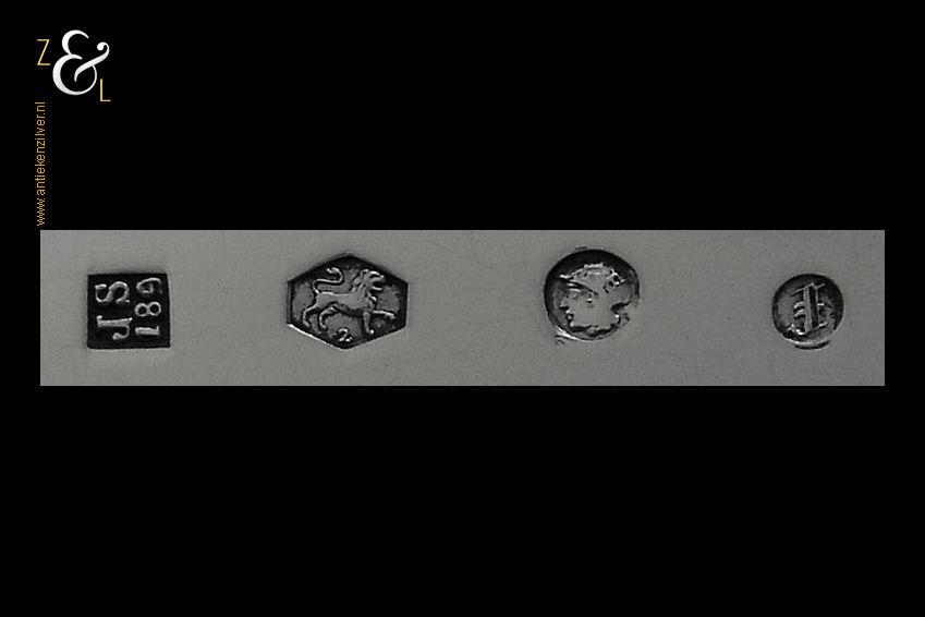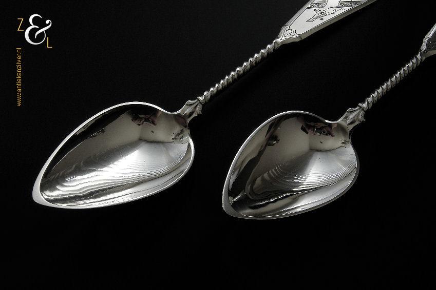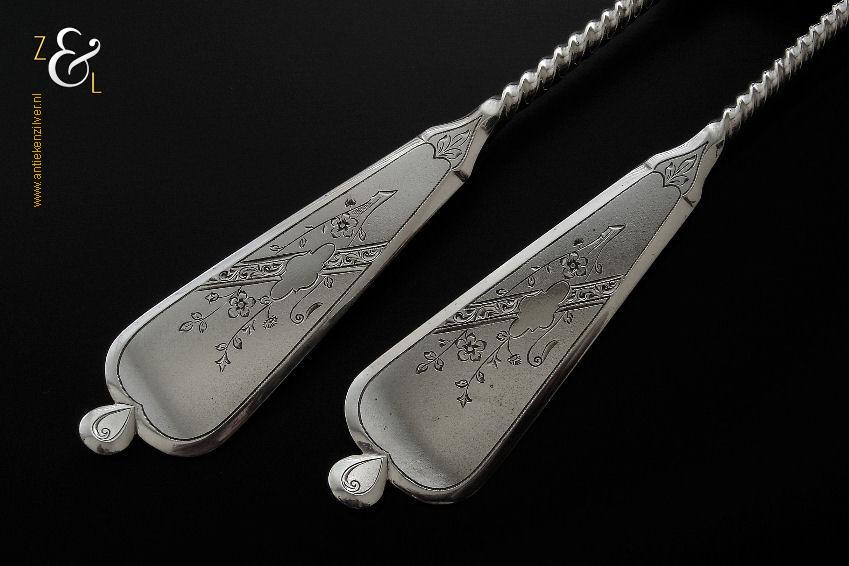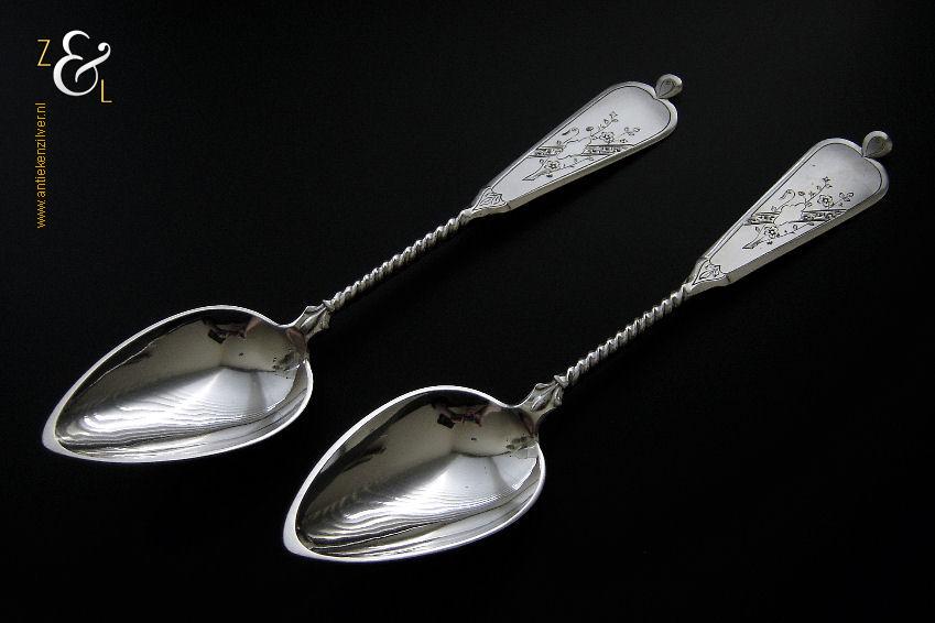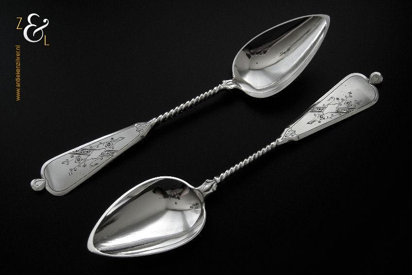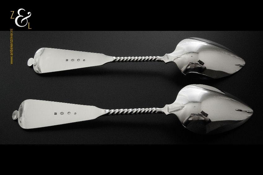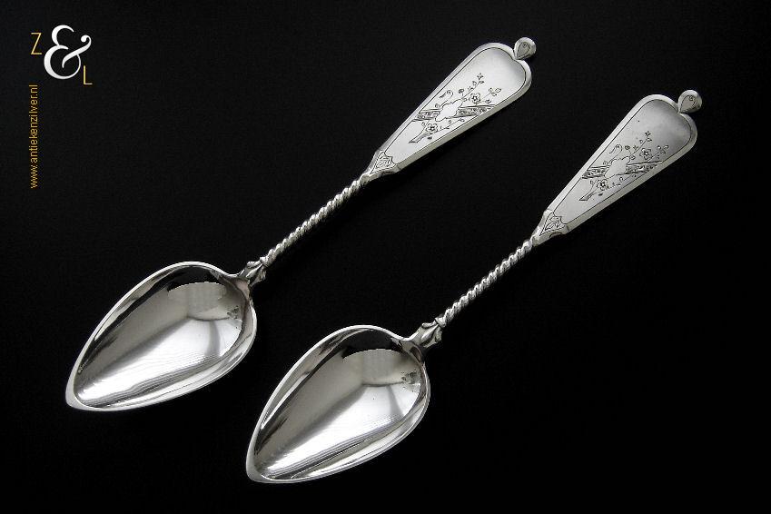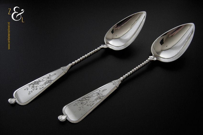 Dit stel groentelepels is gemaakt in Woudsend / Sneek door Johannes Schijfsma (meesterteken JS boven 189 in vierkant) in het jaar 1890 (jaarletter F). Het in Jugendstil uitgevoerde stel zilveren groentelepels heeft getordeerde stelen en de handvatten zijn gegraveerd en gedeeltelijk gematteerd (matteren is een bewerking waarbij de zilversmid het oppervlak van een zilveren voorwerp een matte structuur geeft). De groentelepels wegen samen 195 gram en zijn 27.4 cm lang. De lepelbakken zijn 9.2 cm lang bij 5.5 cm breed.