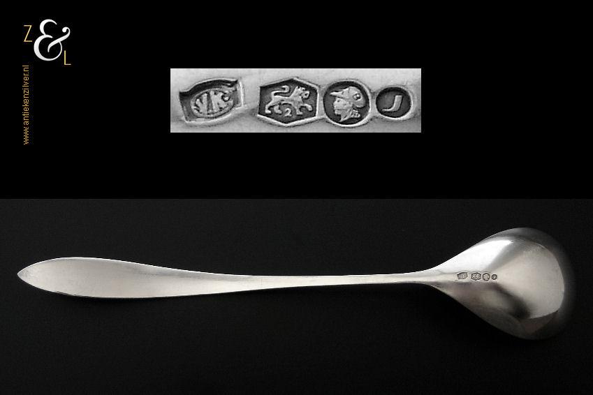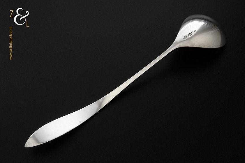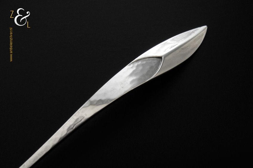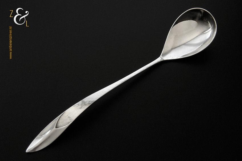 Jamlepel / confituurlepel gemaakt in Zeist door Gerritsen & van Kempen (meesterteken V.K. in G) in het jaar 1969 (jaarletter J). De met een gehamerde steel uitgevoerde zilveren Art Deco jamlepel / confituurlepel model 210 weegt 28 gram en is 17.5 cm lang. De lepelbak is 5 cm lang bij 3.5 cm breed.