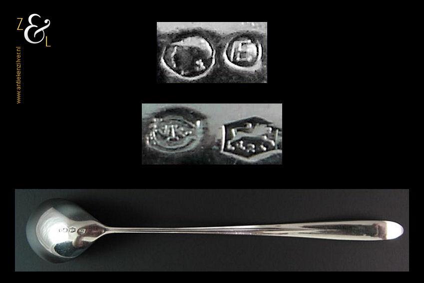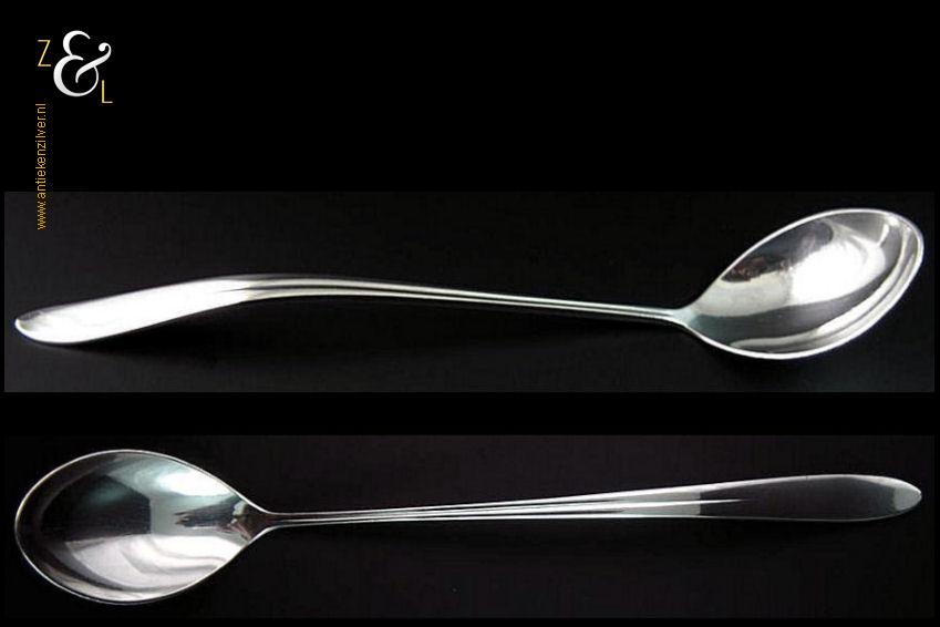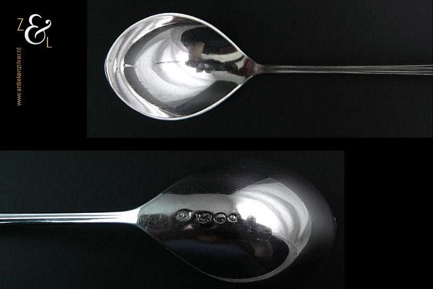 Jamlepel / confituurlepel gemaakt in Zeist door Gerritsen & van Kempen (meesterteken V.K. in G) in het jaar 1939 (jaarletter E). De door Gustav Beran ontworpen jamlepel / confituurlepel is uitgevoerd in model 400 en kwam in productie in het jaar 1935. De zilveren lepel weegt 25 gram en is 16.8 cm lang.
