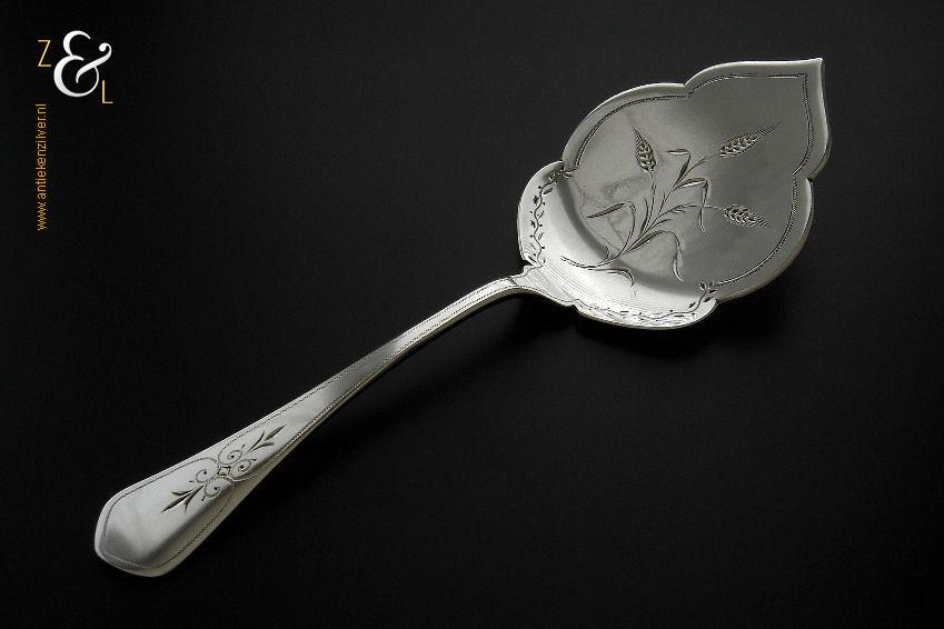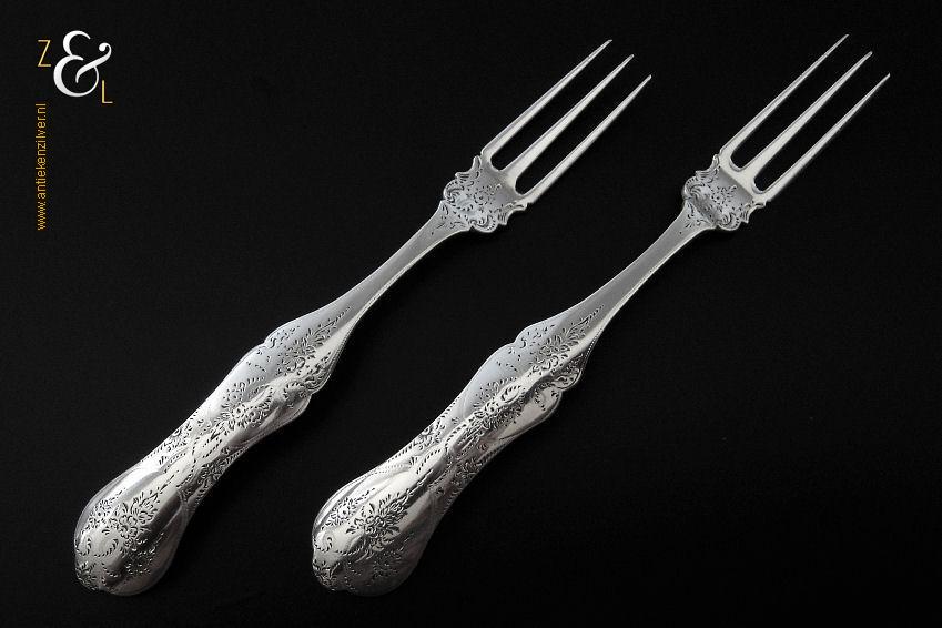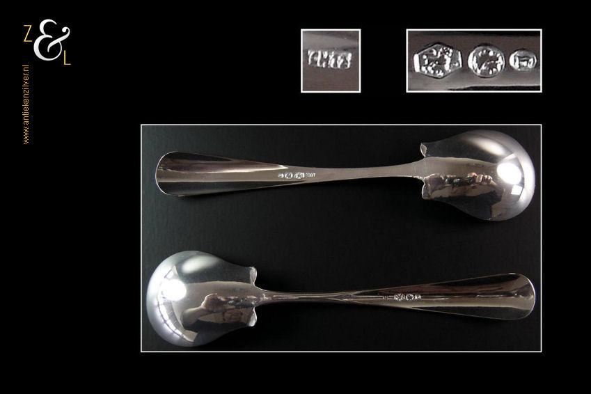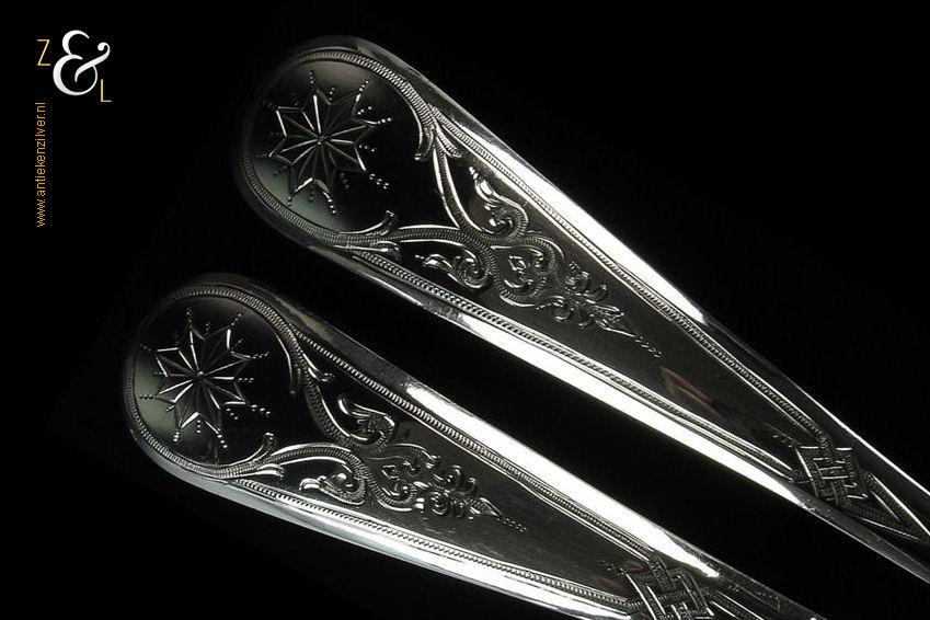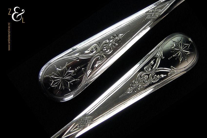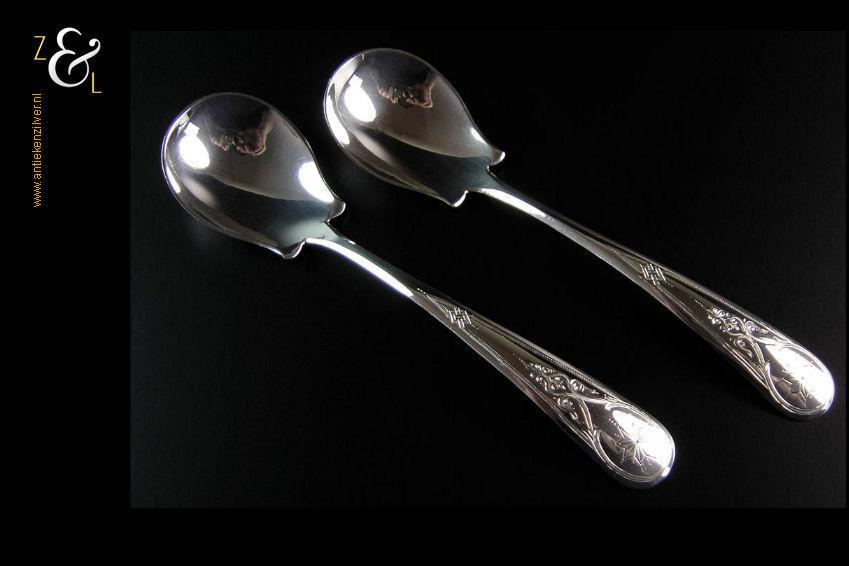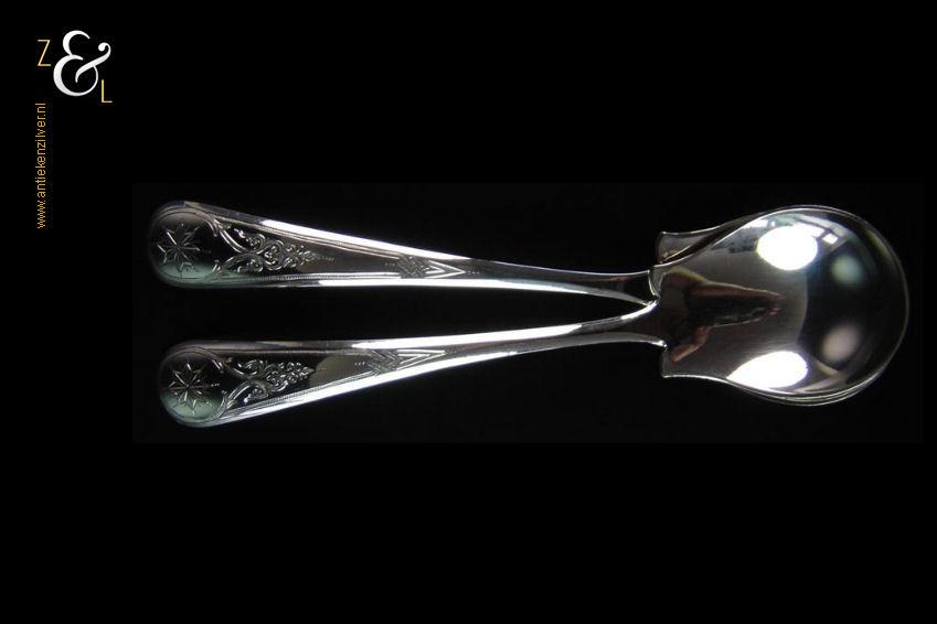 Dit stel jamlepels / confituurlepels is gemaakt in Schoonhoven door Cornelis Hooijkaas (meesterteken CH 12 in rechthoek) in het jaar 1893 (jaarletter I). Deze zilveren Jugendstil jamlepels / confituurlepels waarvan de stelen gegraveerd zijn met achtkantige sterren wegen 41 gram en zijn 15.3 cm lang.