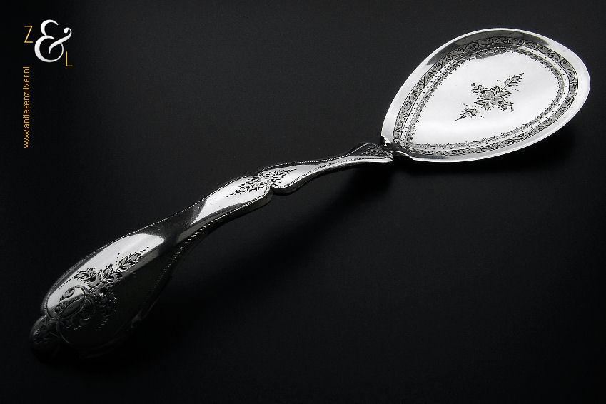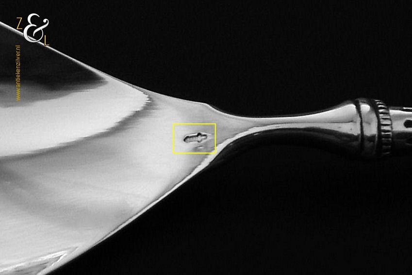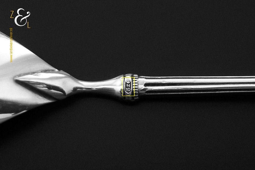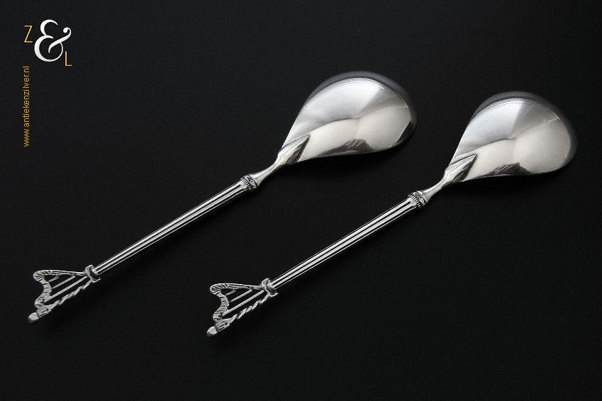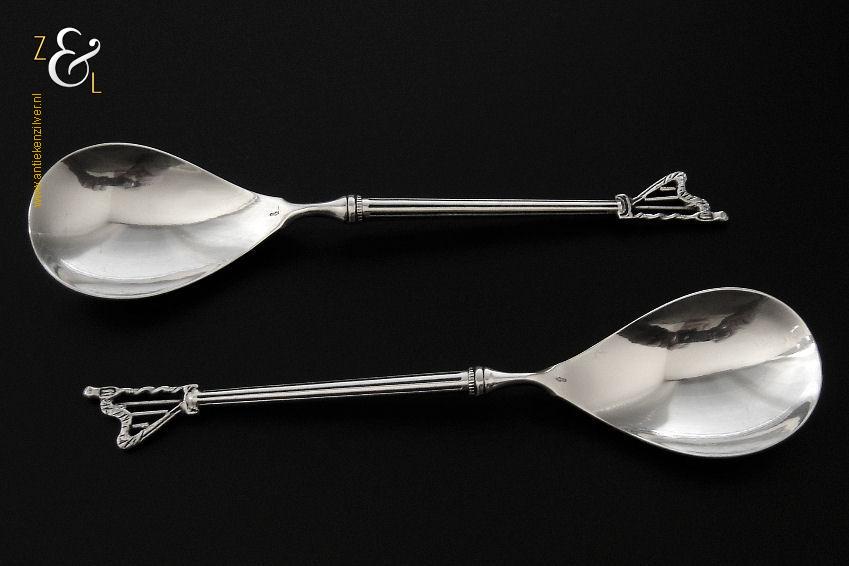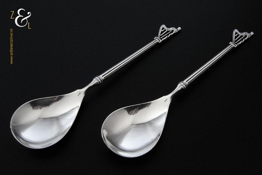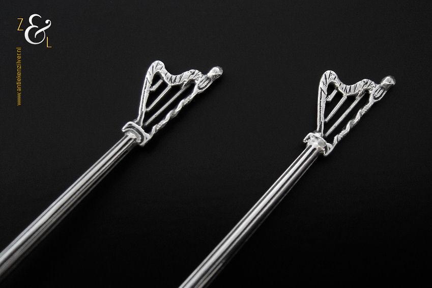 Dit stel jamlepels / confituurlepels is gemaakt in Schoonhoven bij J & J.G. Niekerk / Firma Gebr. Niekerk (meesterteken kroon boven N 10 in zeshoek) tussen 1953 en 1970 (gekeurd met het zilverkeur zwaardje). Het stel zilveren jamlepels / confituurlepels waarvan de stelen bekroond zijn met een harp wegen 28 gram en zijn 12.8 cm lang. De lepelbakken zijn 4.5 cm lang bij 3 cm breed.