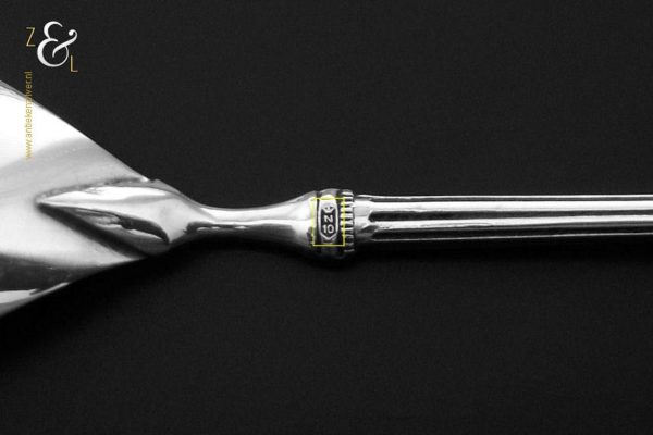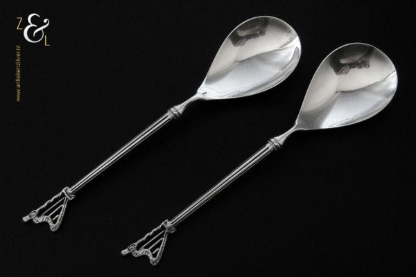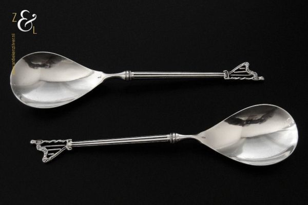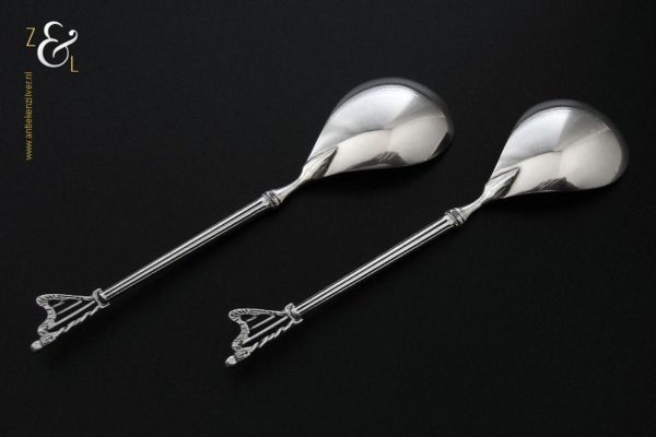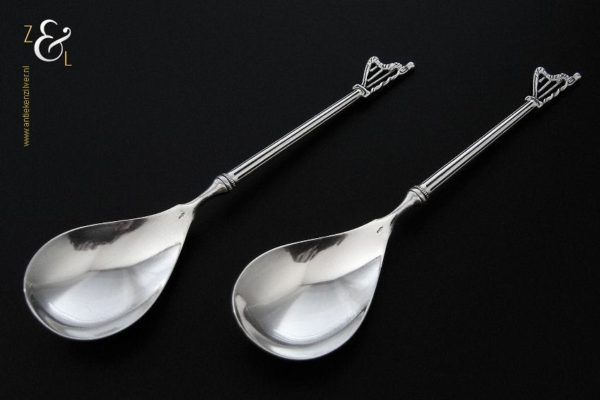 Dit stel jamlepels / confiturenlepels is gemaakt in Schoonhoven bij J & J.G. Niekerk / Firma Gebr. Niekerk (meesterteken kroon boven N 10 in zeshoek) tussen 1953 en 1970 (gekeurd met het zilverkeur zwaardje). Het stel zilveren jamlepels / confiturenlepels waarvan de stelen bekroond zijn met een harp wegen 28 gram en zijn 12.8 cm lang. De lepelbakken zijn 4.5 cm lang bij 3 cm breed.
