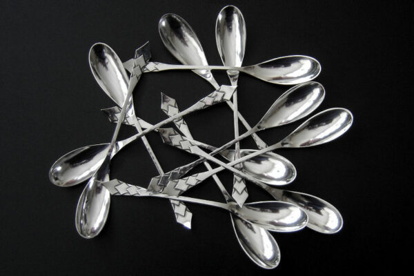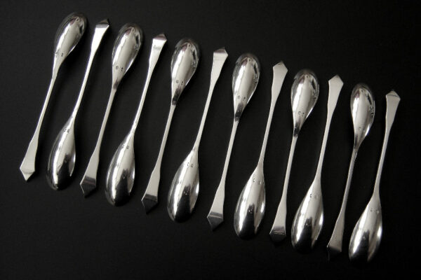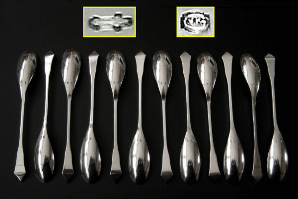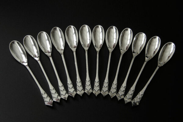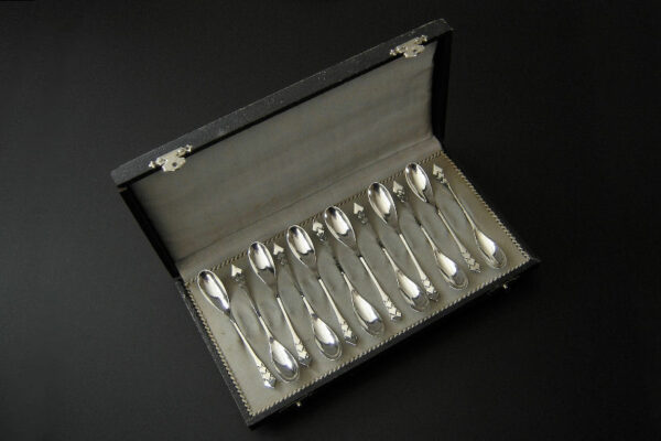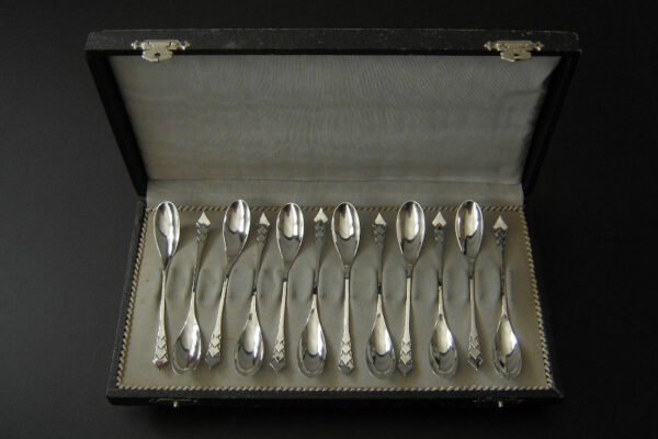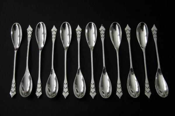 Deze 12 koffielepels / theelepels zijn gemaakt in Zeist door Gerritsen & van Kempen N.V. (meesterteken V.K. in G) tussen 1926 en 1953. De koffielepels / theelepels zijn gekeurd met het zilverkeur zwaardje dit is een gehaltemerk voor zilveren voorwerpen dat in de periode tussen 1906 en 1953 in gebruik was. De koffielepels / theelepels hebben het originele zwarte foedraal dat in een gebruikte staat verkeert (de beschadigde hoeken zijn bijgewerkt met een viltstift). De zilveren koffielepels / theelepels hebben een weinig voorkomend apart model steel en zijn in Art Deco stijl uitgevoerd. De lepels wegen 120 gram en zijn 11.8 cm lang. Het foedraal is 27 cm lang bij 14.3 cm breed bij 3.4 cm hoog.