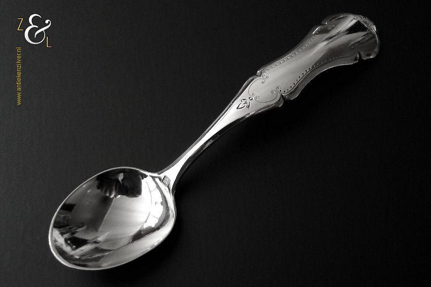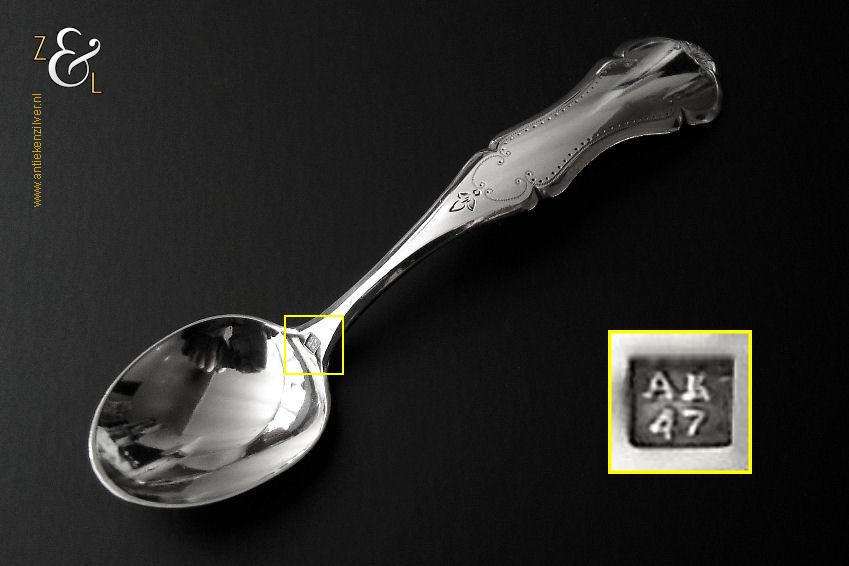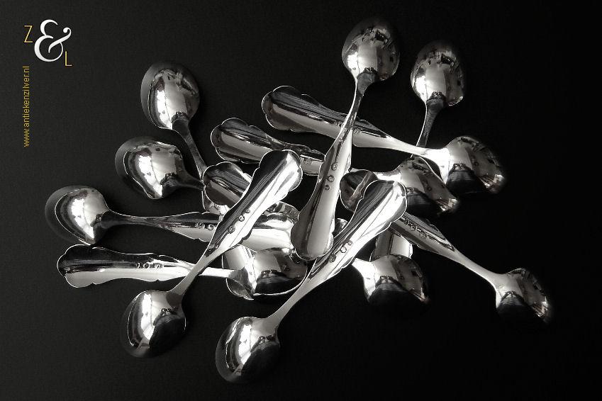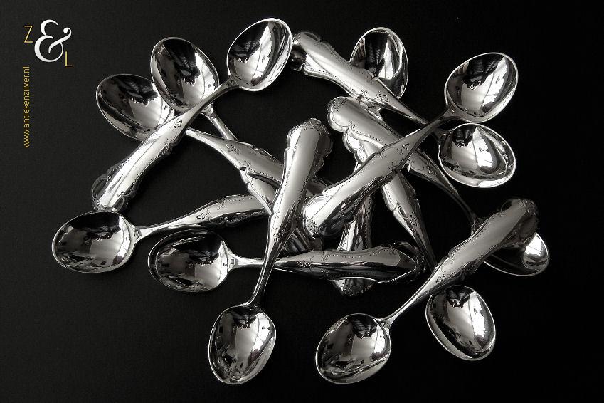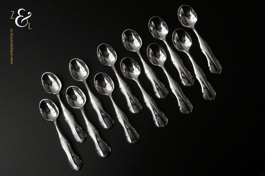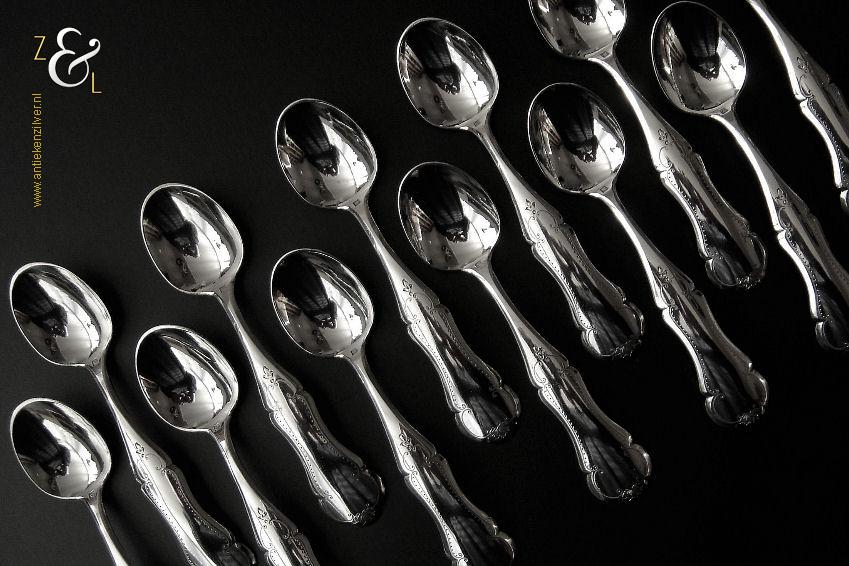 Deze 12 koffielepels / theelepels / ijslepels zijn gemaakt in Schoonhoven door Adrianus Kuijlenburg Pz. (meesterteken AK boven 47 in vierkant) in het jaar 1876 (jaarletter R). De zilveren in Neostijl uitgevoerde koffielepels / theelepels / ijslepels waarvan de stelen fijntjes gegraveerd zijn hebben ronde ovale lepelbakken. De koffielepels / theelepels / ijslepels wegen 172 gram en zijn 12 cm lang. De lepels zijn door hun ronde ovale lepelbakken goed te gebruiken als kleine ijslepel.