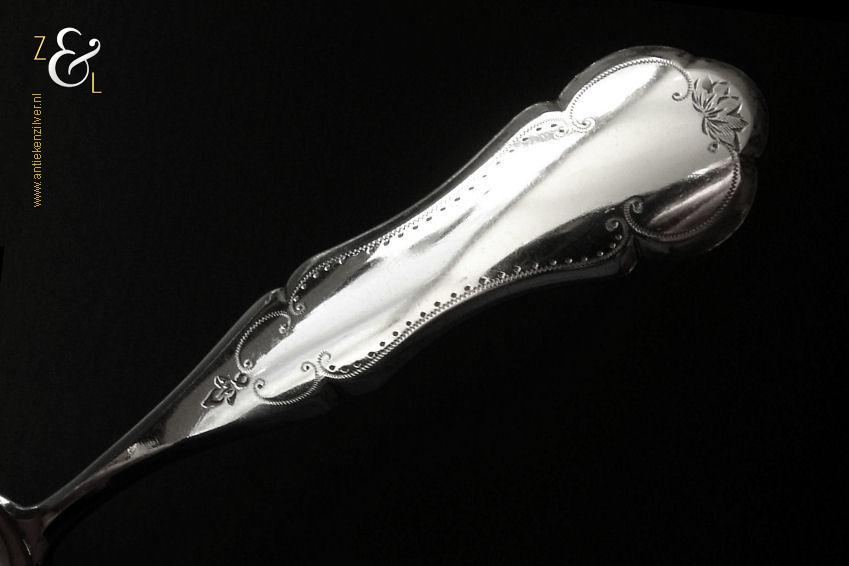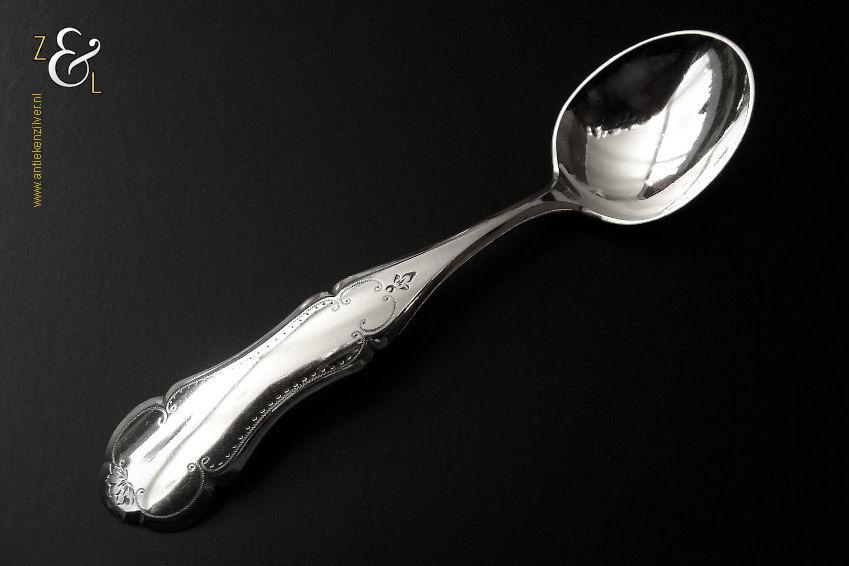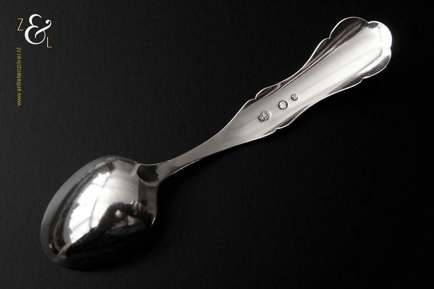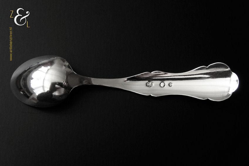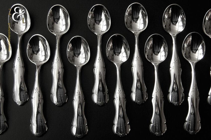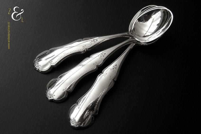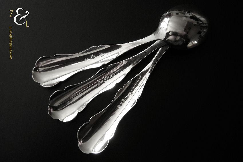 Deze 12 koffielepels / theelepels / ijslepels zijn gemaakt in Schoonhoven door Adrianus Kuijlenburg Pz. (meesterteken AK boven 47 in vierkant) in het jaar 1876 (jaarletter R). De zilveren in Neostijl uitgevoerde koffielepels / theelepels / ijslepels waarvan de stelen fijntjes gegraveerd zijn hebben ronde ovale lepelbakken. De koffielepels / theelepels / ijslepels wegen 172 gram en zijn 12 cm lang. De lepels zijn door hun ronde ovale lepelbakken goed te gebruiken als kleine ijslepel.