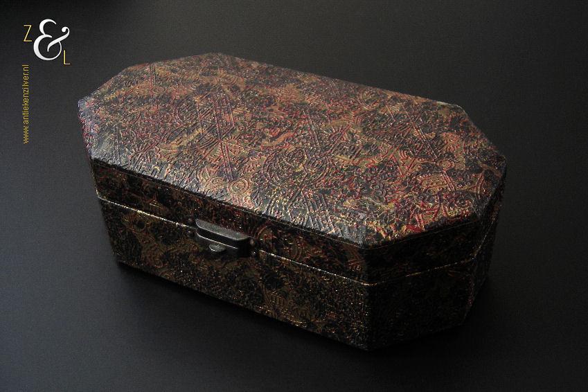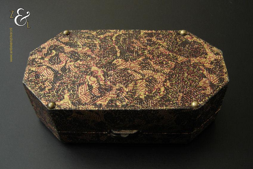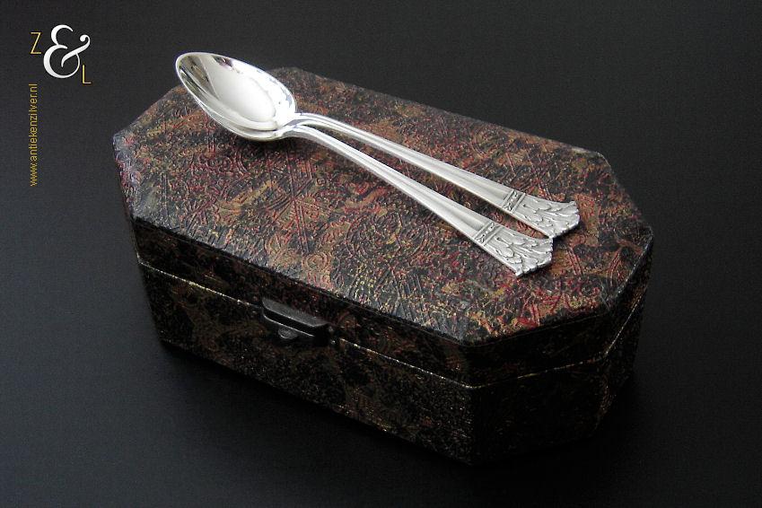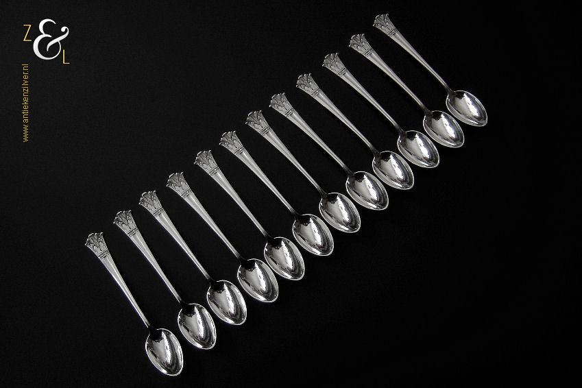 Deze 12 koffielepels / theelepels / demitasselepels* zijn gemaakt in Zeist door Gerritsen & van Kempen N.V. ( meesterteken V.K. in G) tussen 1926 en 1953. De koffielepels / theelepels / demitasselepels zijn gekeurd met het zilverkeur zwaardje dit is een gehaltemerk voor zilveren voorwerpen dat in de periode tussen 1906 en 1953 in gebruik was. De koffielepels / theelepels / demitasselepels hebben een in de kleuren zwart, rood en goud en in Chinese stijl (chinoiserie) uitgevoerd achtkantig lepeldoosje (heeft lichte gebruikssporen) met aan de binnenzijde van het deksel de tekst: K. van Zijp Juwelier Stadhuisplein Zaandam* (de verkopende winkelier). De zilveren koffielepels / theelepels / demitasselepels waarvan de stelen bekroond zijn met een gestileerd acanthusblad* wegen 138 gram en zijn 11.2 cm lang. Het lepeldoosje is 14 cm lang bij 7.5 cm breed bij 4.7 cm hoog.