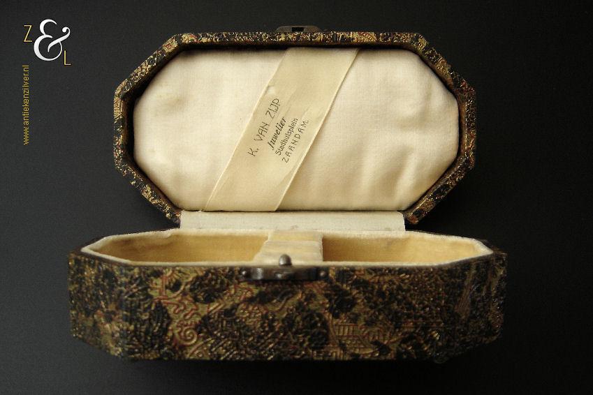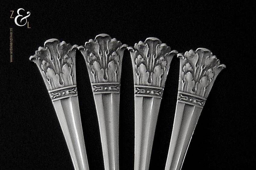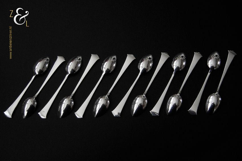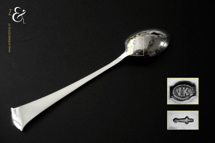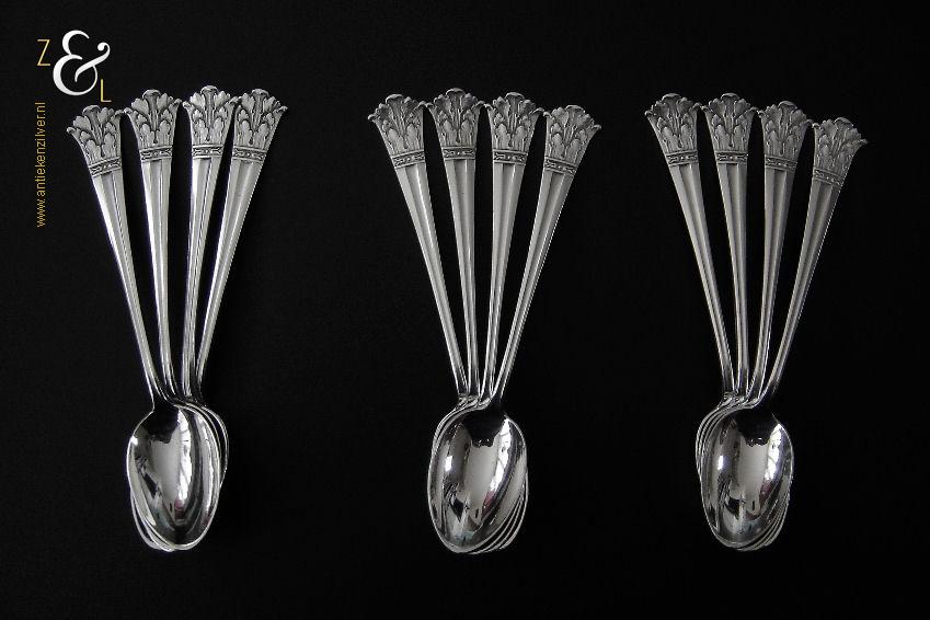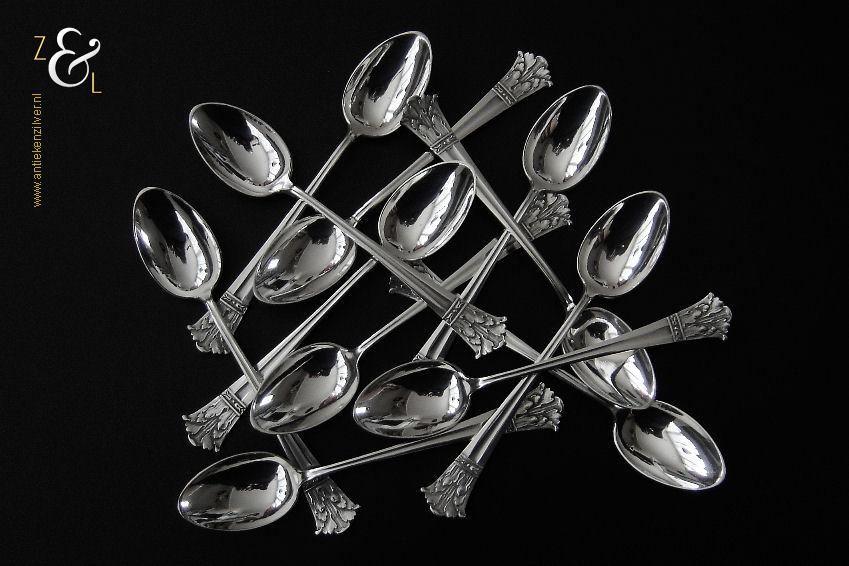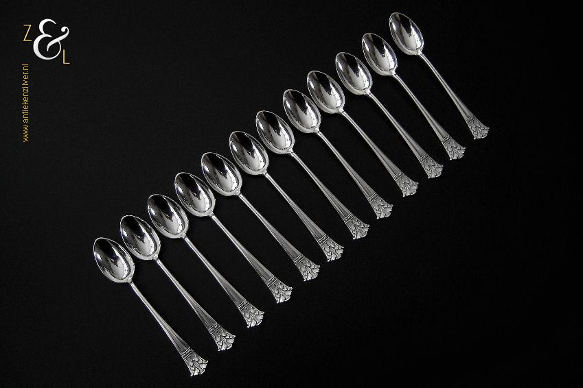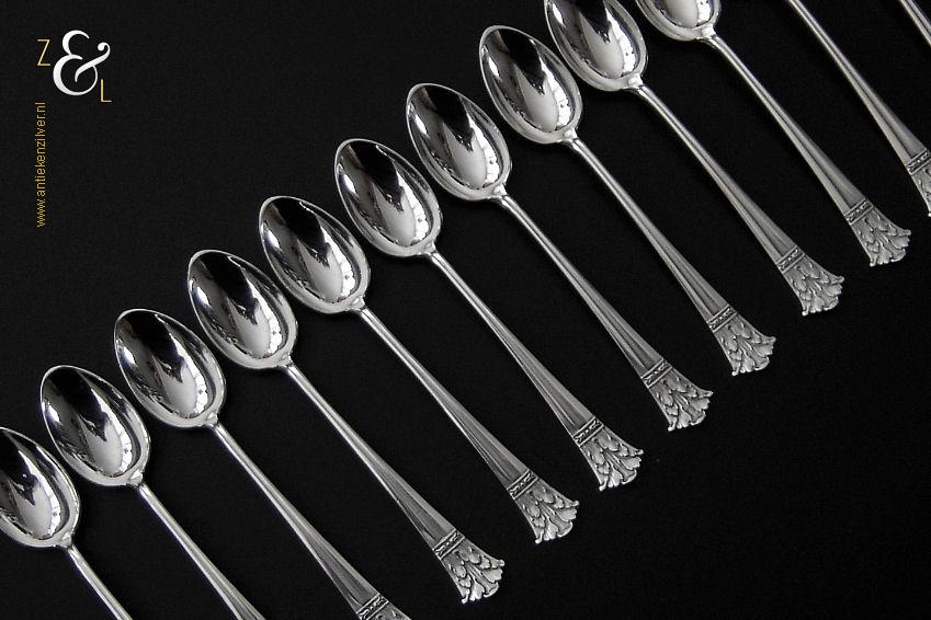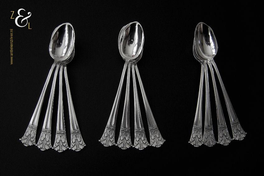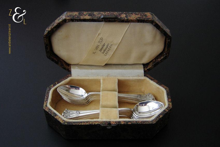 Deze 12 koffielepels / theelepels / demitasselepels* zijn gemaakt in Zeist door Gerritsen & van Kempen N.V. ( meesterteken V.K. in G) tussen 1926 en 1953. De koffielepels / theelepels / demitasselepels zijn gekeurd met het zilverkeur zwaardje dit is een gehaltemerk voor zilveren voorwerpen dat in de periode tussen 1906 en 1953 in gebruik was. De koffielepels / theelepels / demitasselepels hebben een in de kleuren zwart, rood en goud en in Chinese stijl (chinoiserie) uitgevoerd achtkantig lepeldoosje (heeft lichte gebruikssporen) met aan de binnenzijde van het deksel de tekst: K. van Zijp Juwelier Stadhuisplein Zaandam* (de verkopende winkelier). De zilveren koffielepels / theelepels / demitasselepels waarvan de stelen bekroond zijn met een gestileerd acanthusblad* wegen 138 gram en zijn 11.2 cm lang. Het lepeldoosje is 14 cm lang bij 7.5 cm breed bij 4.7 cm hoog.