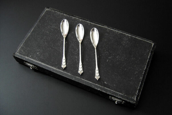 Deze 12 koffielepels / theelepels zijn gemaakt in Zeist door Gerritsen & van Kempen N.V. (meesterteken V.K. in G) tussen 1926 en 1953. De koffielepels / theelepels zijn gekeurd met het zilverkeur zwaardje dit is een gehaltemerk voor zilveren voorwerpen dat in de periode tussen 1906 en 1953 in gebruik was. De koffielepels / theelepels hebben het originele zwarte foedraal dat in een gebruikte staat verkeert (de beschadigde hoeken zijn bijgewerkt met een viltstift). De zilveren koffielepels / theelepels hebben een weinig voorkomend apart model steel en zijn in Art Deco stijl uitgevoerd. De lepels wegen 120 gram en zijn 11.8 cm lang. Het foedraal is 27 cm lang bij 14.3 cm breed bij 3.4 cm hoog.