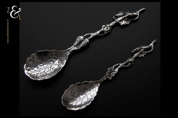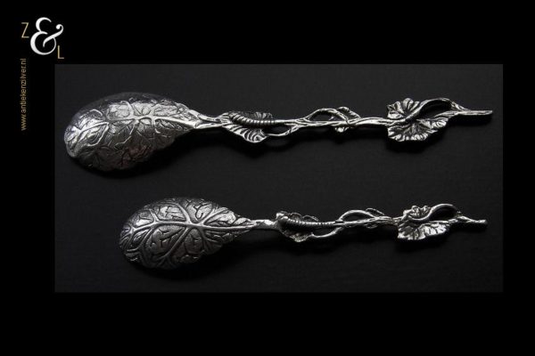 Deze koffielepel en mokkalepel zijn gemaakt in de 20e eeuw (vijftiger jaren) in Nederland. De lepels zijn uitgevoerd met een takje met blaadjes als steel en een blaadje als lepelbak. Aan de achterzijde van de steel zit op een blaadje een rups. De koffielepel en mokkalepel die geen keuren dragen wegen samen 18 gram en zijn 8.7 cm en 11 cm lang.