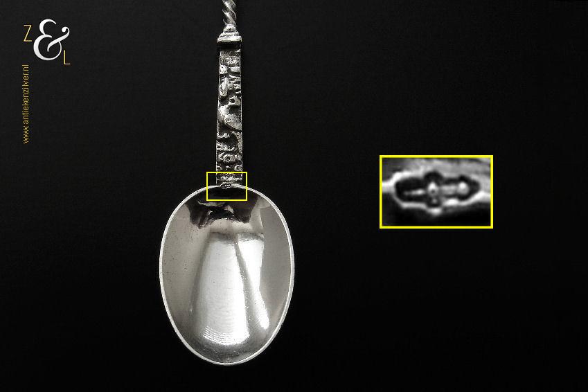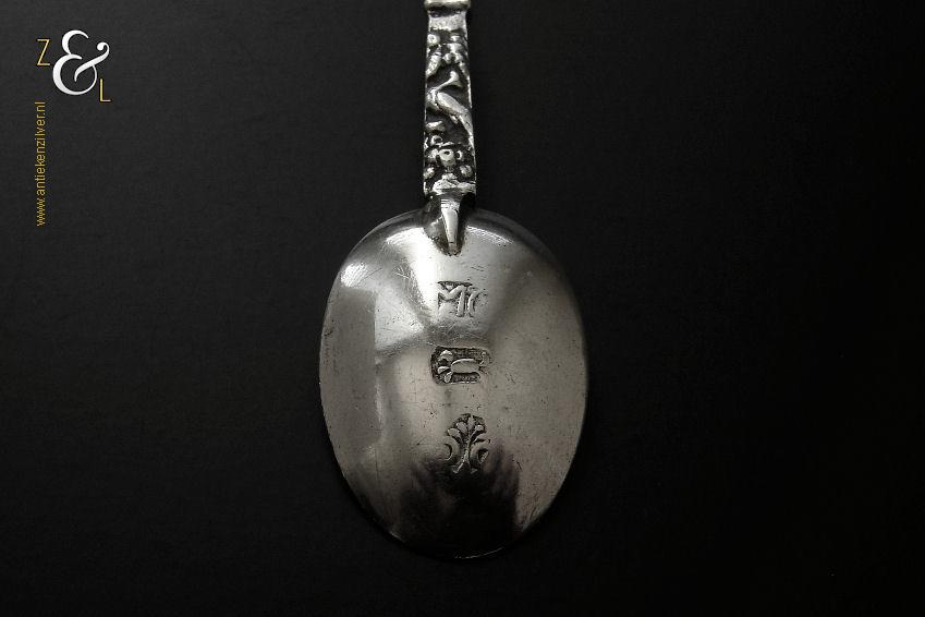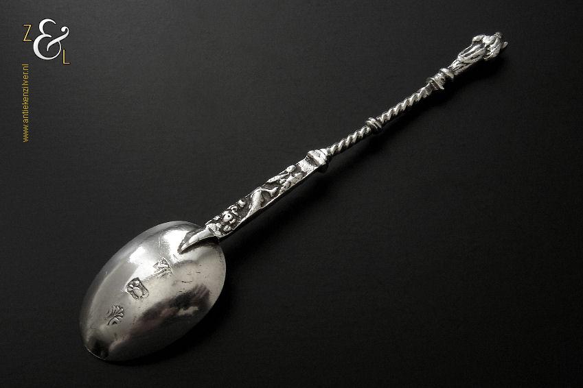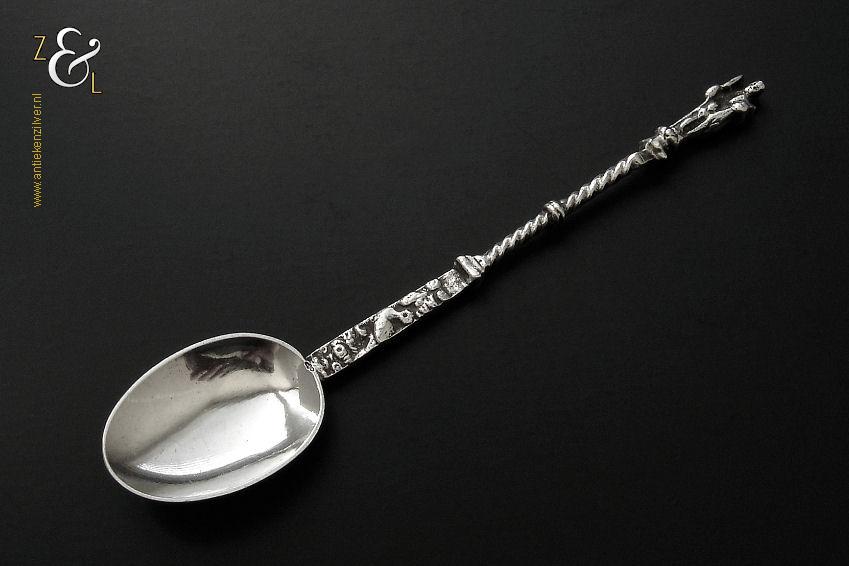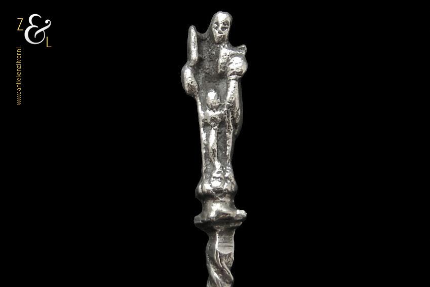 Deze koffielepel / theelepel is in de 19e eeuw gemaakt in Nederland en is gekeurd met het zilverkeur zwaardje (dit is het gehaltemerk voor kleine zilveren werken) dat tussen 1814 en 1905 in gebruik was. De zilveren Neostijl koffielepel / theelepel die gemaakt is naar een model uit de 18e eeuw heeft een getordeerde steel die bekroond is met een herder of apostel en een lepelbak die aan de achterzijde drie fantasiekeuren draagt. De koffielepel / theelepel weegt 18 gram en is 13.3 cm lang.