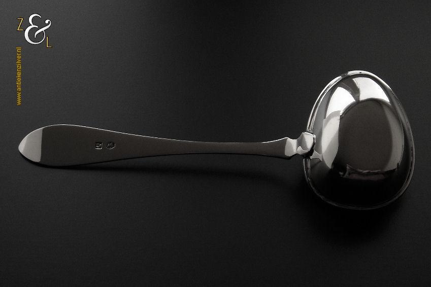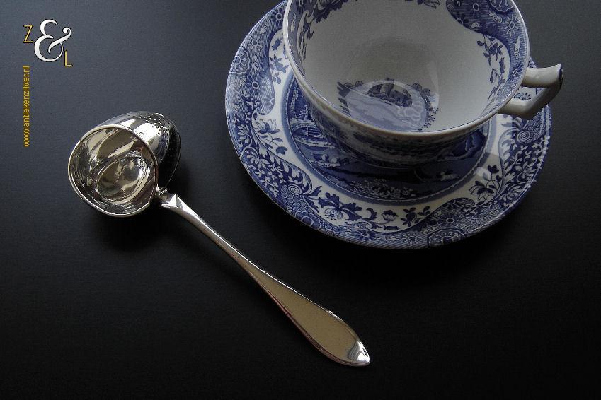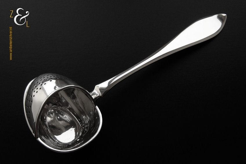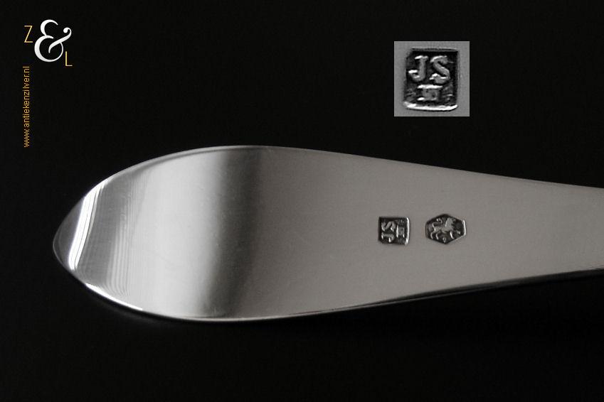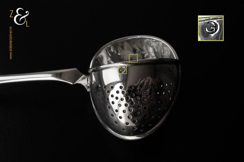 Theezeeflepel gemaakt in Sneek Friesland door de Firma Johan Schijfsma / J. Schijfsma / A.M. Sustring & J. Schijfsma (meesterteken JS boven III in vierkant) in het jaar 1916 (jaarletter G). Deze in Art Deco stijl zwaar uitgevoerde zilveren theezeeflepel model puntfilet weegt 66 gram en is 17.1 cm lang. De bak is 5.8 cm lang bij 4.5 cm breed. Het kantoorstempel van Leeuwarden “Minerva” is in de bak gestempeld en daardoor moeilijk te fotograferen (zie foto). De theekop is ter decoratie.