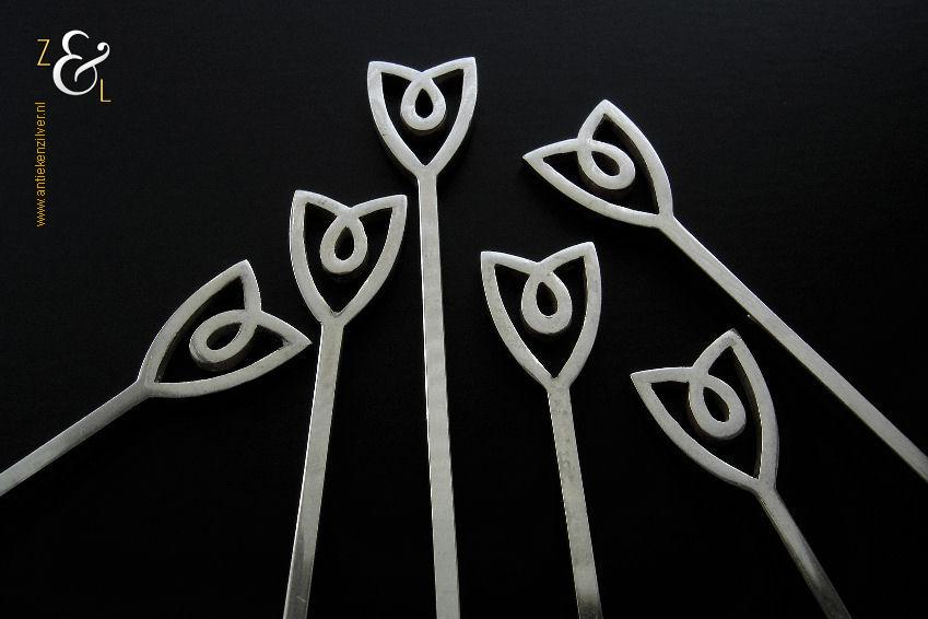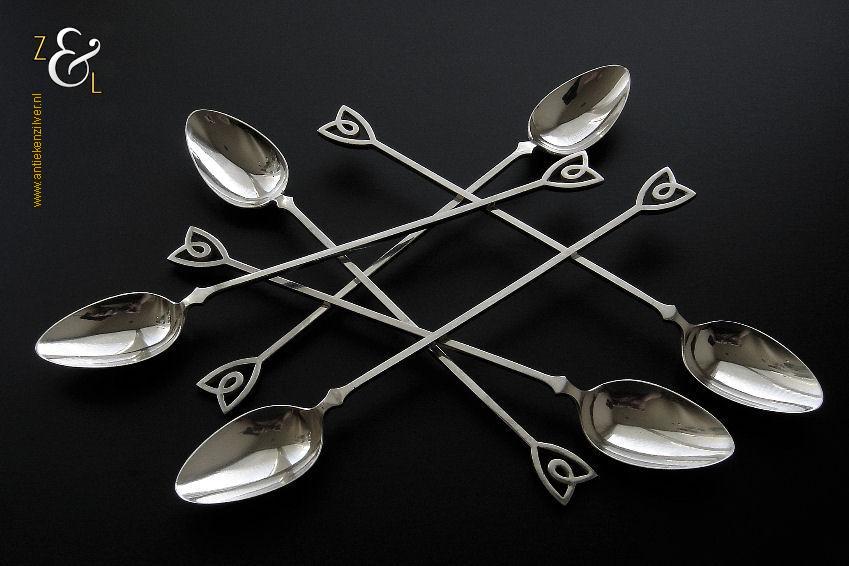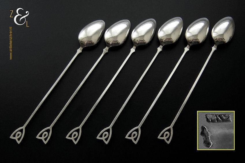 Deze 6 longdrinklepels zijn gemaakt in Voorschoten door de Firma J.M. van Kempen & Zonen (meesterteken VK liggend maantje in rechthoek) tussen 1906 en 1924 (gekeurd met het zilverkeur zwaardje). De Art Deco longdrinklepels hebben vierkante stelen met aan het uiteinde een gestileerde tulp, ze zijn 17.1 cm lang en wegen 97 gram. De zilveren longdrinklepels zijn ook goed te gebruiken als koffie- of theelepel in een mok of als Cocktail-, Sorbet- of IJslepel.