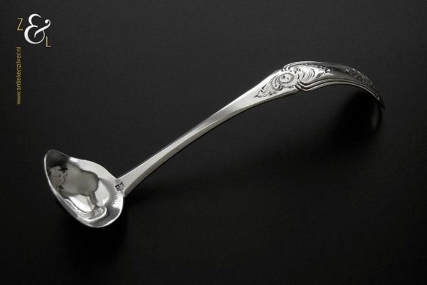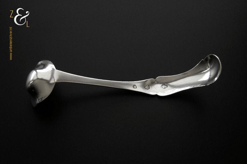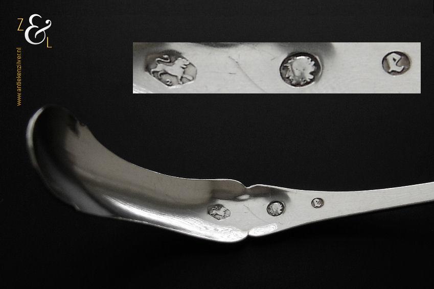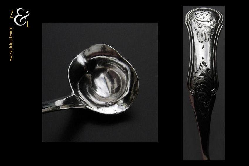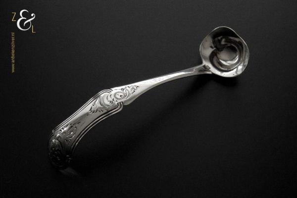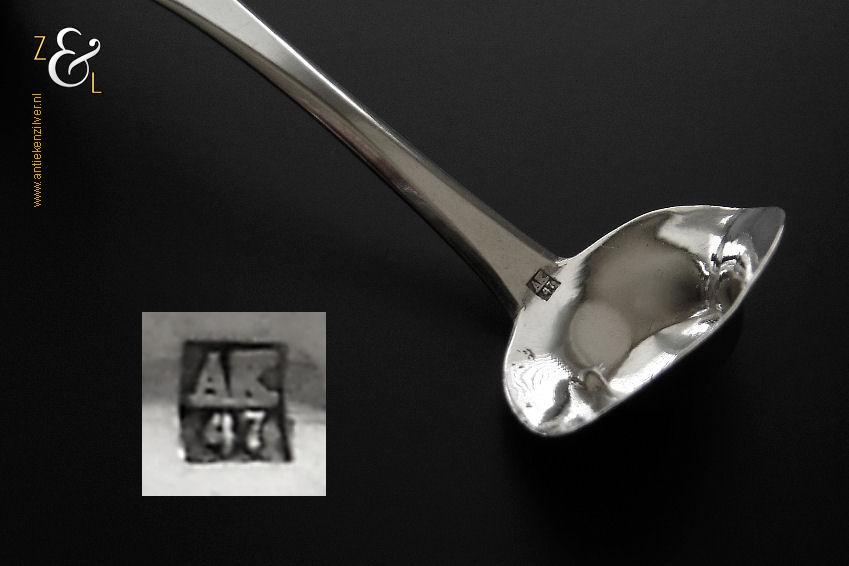 Mosterdlepel gemaakt in Schoonhoven door Adrianus Kuijlenburg (meesterteken AK boven 47 in vierkant) in het jaar 1864 (jaarletter E). Deze zilveren Biedermeier mosterdlepel heeft een apart gevormde bak en een gegraveerd handvat met filetrand. De mosterdlepel weegt 7 gram en is 10 cm lang.