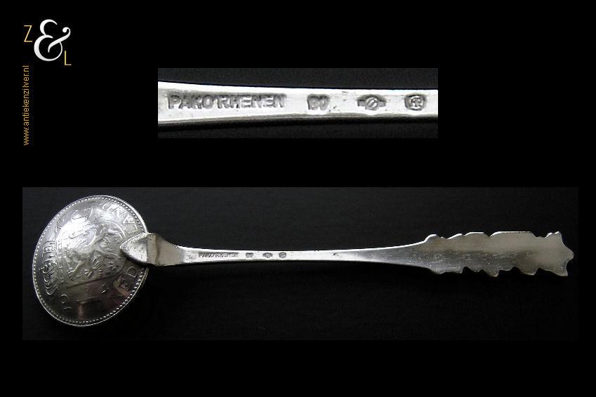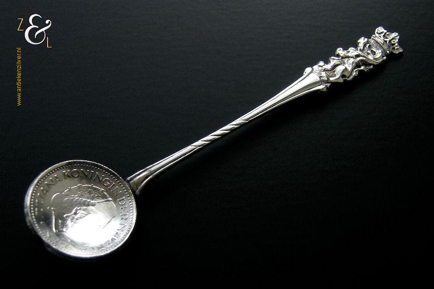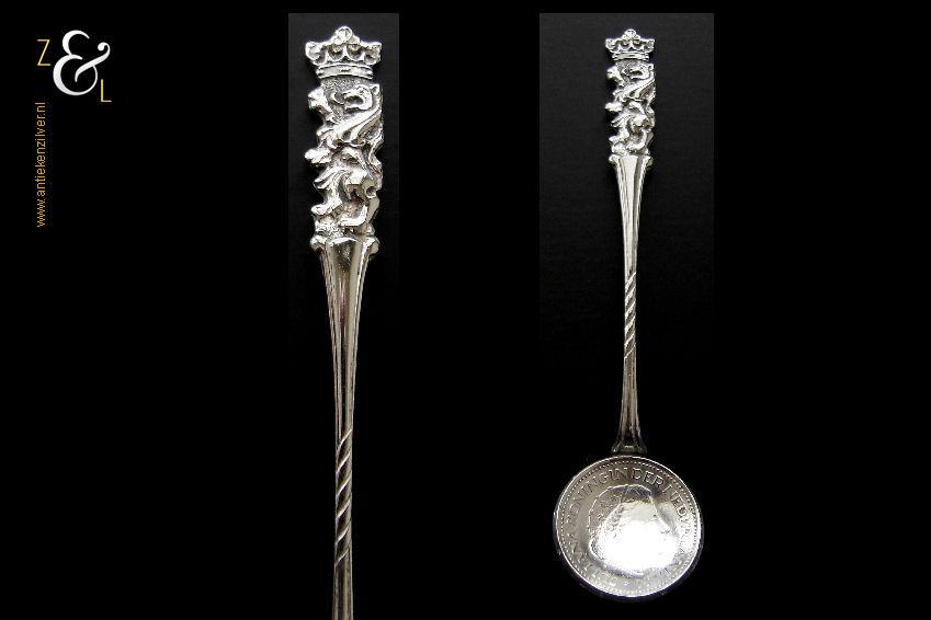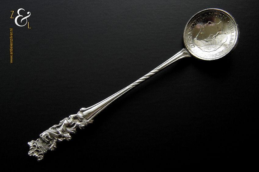 Deze muntlepel is gemaakt bij de zilversmederij Pako Rhenen en bestaat uit een zilveren Juliana gulden geslagen in 1972 en een verzilverde steel met een staande leeuw met kroon (Luctor et Emergo – ik worstel en kom boven). De muntlepel is 6.9 cm lang en weegt 10 gram.