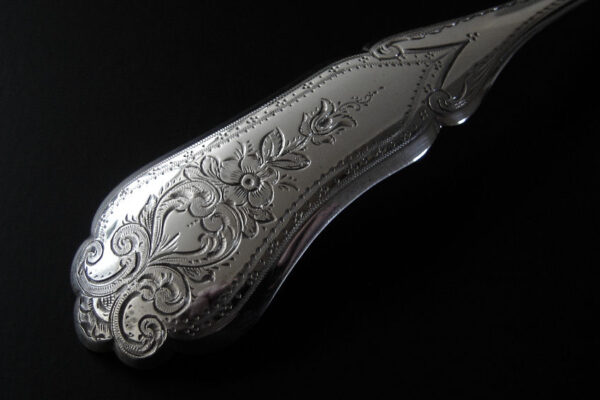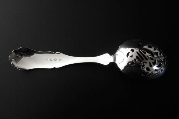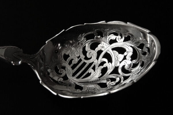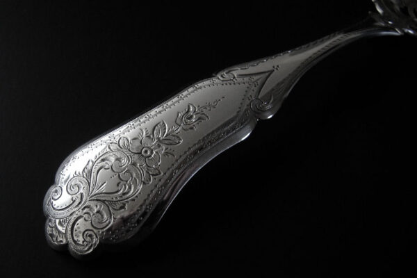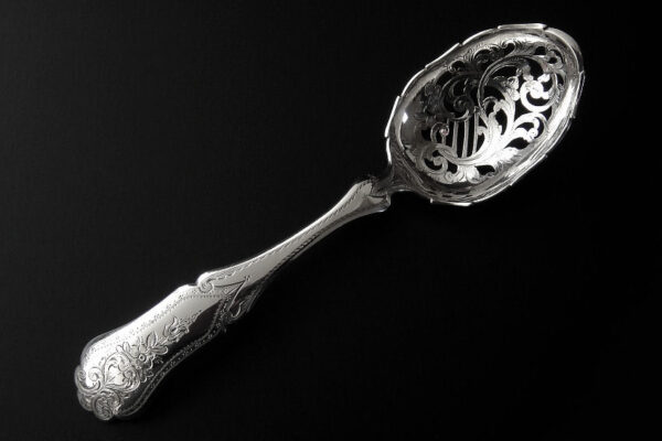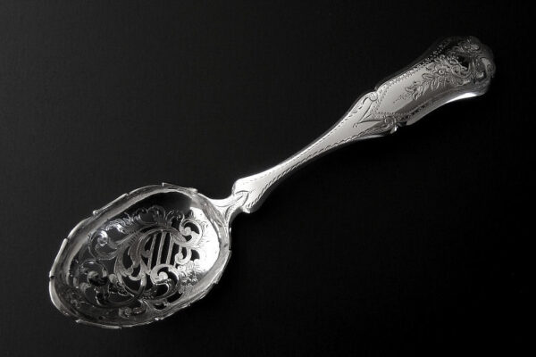 Deze natfruitlepel is gemaakt in Amsterdam door Johannes Jacobus Torlau (meesterteken hartje J boven J T in vierkant) in het jaar 1870 (jaarletter L). De zilveren Biedermeier natfruitlepel heeft een op de hand uitgezaagde steel en lepelbak met geschulpte rand die diep gegraveerd zijn met c-vormige bladervoluten, rocailles en bloemmotieven. De natfruitlepel weegt 61 gram en is 22.3 cm lang. De ovale lepelbak is 8 cm lang bij 5.3 cm breed.