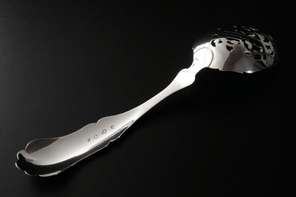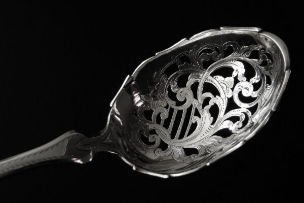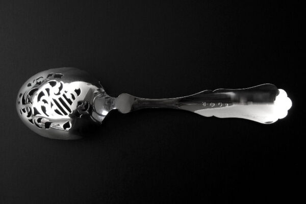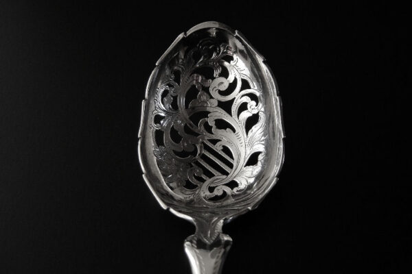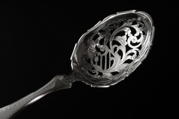 Deze natfruitlepel is gemaakt in Amsterdam door Johannes Jacobus Torlau (meesterteken hartje J boven J T in vierkant) in het jaar 1870 (jaarletter L). De zilveren Biedermeier natfruitlepel heeft een op de hand uitgezaagde steel en lepelbak met geschulpte rand die diep gegraveerd zijn met c-vormige bladervoluten, rocailles en bloemmotieven. De natfruitlepel weegt 61 gram en is 22.3 cm lang. De ovale lepelbak is 8 cm lang bij 5.3 cm breed.