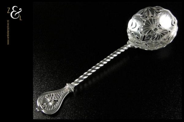Natfruitlepel gemaakt in Schoonhoven door Jan Boon (meesterteken AK boven +47+ in vierkant) in het jaar 1907 (jaarletter X). De zilveren Art Deco natfruitlepel heeft een getordeerde steel met een gegoten handvat. Zowel het handvat als de lepelbak zijn uitgezaagd en gegraveerd met een vlindermotief. De natfruitlepel weegt 29 gram en is 15.4 cm lang. De lepelbak heeft een diameter van 4.7 cm.