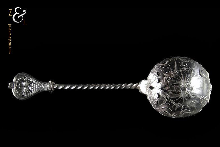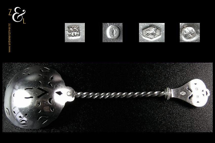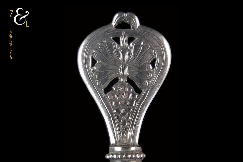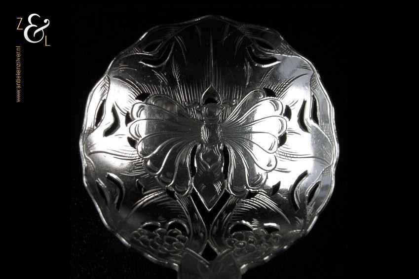 Natfruitlepel gemaakt in Schoonhoven door Jan Boon (meesterteken AK boven +47+ in vierkant) in het jaar 1907 (jaarletter X). De zilveren Art Deco natfruitlepel heeft een getordeerde steel met een gegoten handvat. Zowel het handvat als de lepelbak zijn uitgezaagd en gegraveerd met een vlindermotief. De natfruitlepel weegt 29 gram en is 15.4 cm lang. De lepelbak heeft een diameter van 4.7 cm.