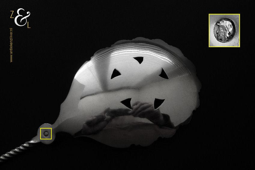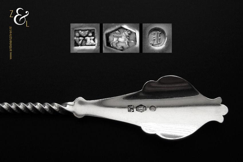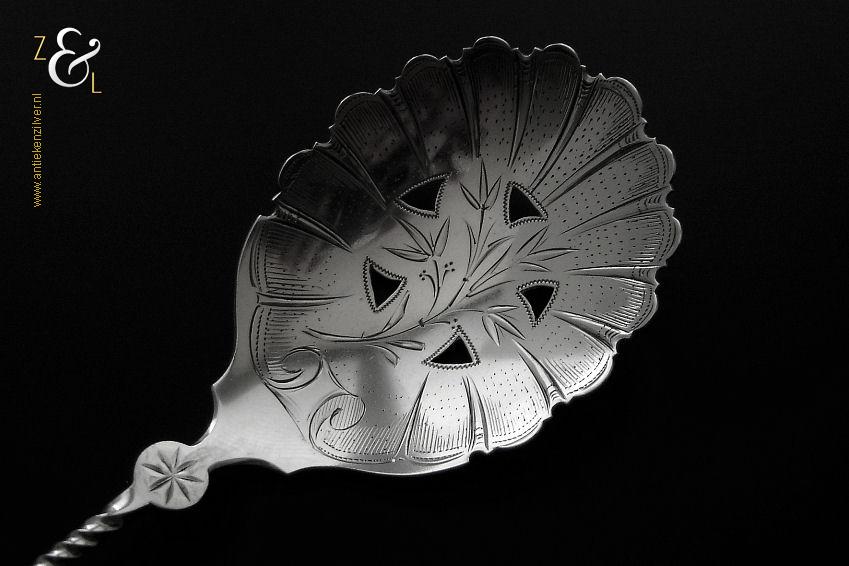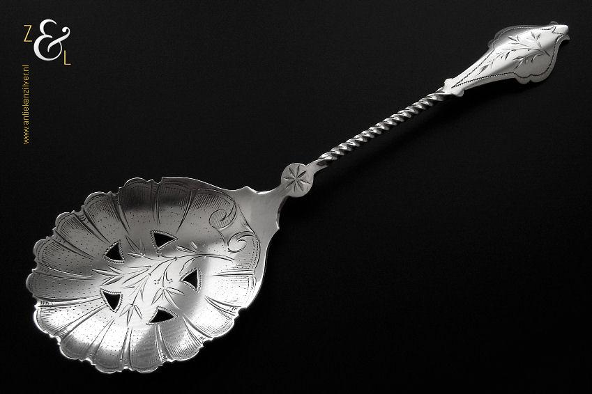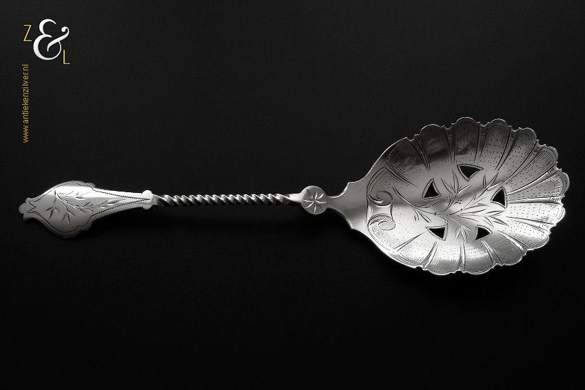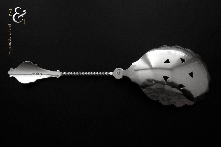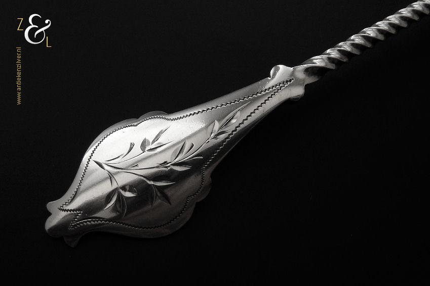 Deze natfruitlepel is gemaakt in Voorschoten bij de Firma J.M. van Kempen & Zonen (meesterteken liggend maantje tussen punten boven VK in vierkant) in het jaar 1890 (jaarletter F). De zilveren Neostijl natfruitlepel die een getordeerde steel heeft is uitgevoerd met een uitgezaagd handvat dat gegraveerd is met een bladmotief. De lepelbak is fijntjes gegraveerd met een bladmotief en is uitgezaagd en licht gematteerd (matteren is een bewerking waarbij de zilversmid het oppervlak van een zilveren voorwerp een matte structuur geeft). De natfruitlepel weegt 70 gram en is 22.1 cm lang. De lepelbak is 8.8 cm lang bij 6.7 cm breed.