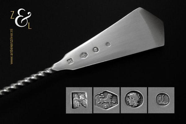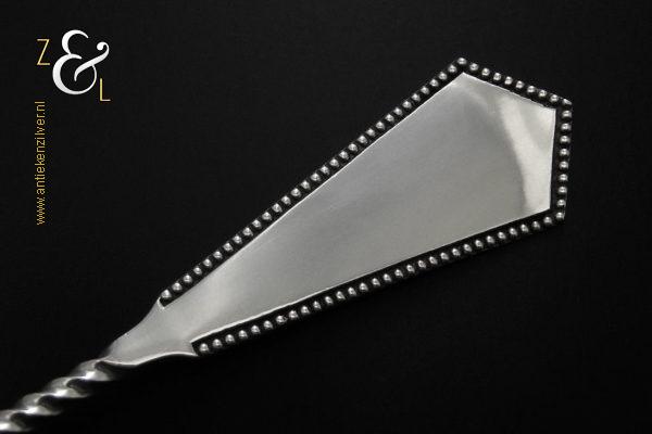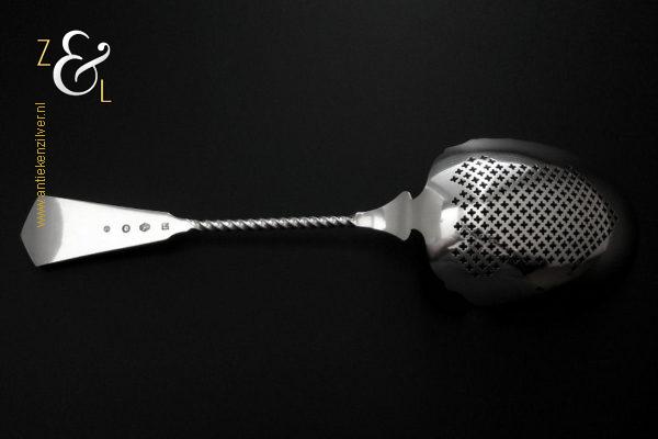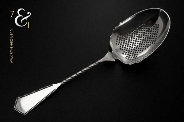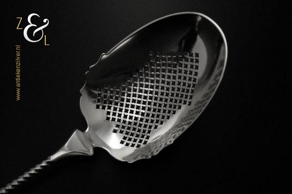 Deze natfruitlepel is gemaakt in Schoonhoven door Adrianus Andries Graves Kooiman (meesterteken A.G. boven K. in vierkant) in het jaar 1895 (jaarletter L). De royale zilveren Jugendstil natfruitlepel die een getordeerde steel heeft is uitgevoerd met een met plusjes uitgezaagde diepe lepelbak. Tevens heeft de natfruitlepel een hoekig in een punt uitlopend handvat die met parelrand is uitgevoerd. De natfruitlepel weegt 70 gram en is 24 cm lang. De lepelbak is 9.1 cm lang bij 6.2 cm breed.