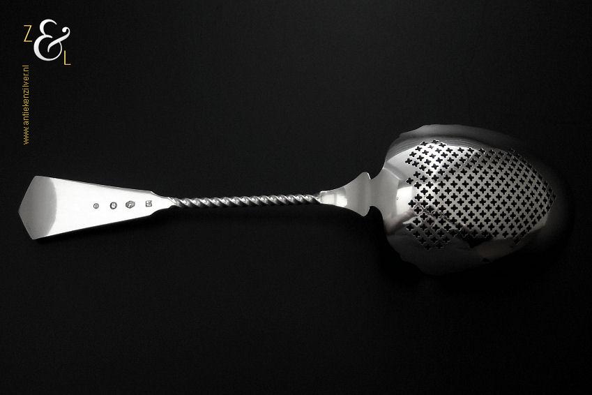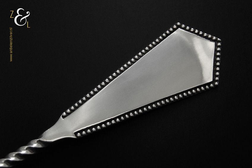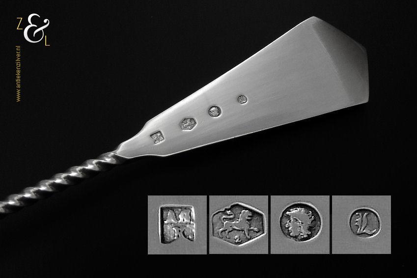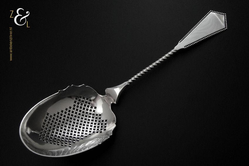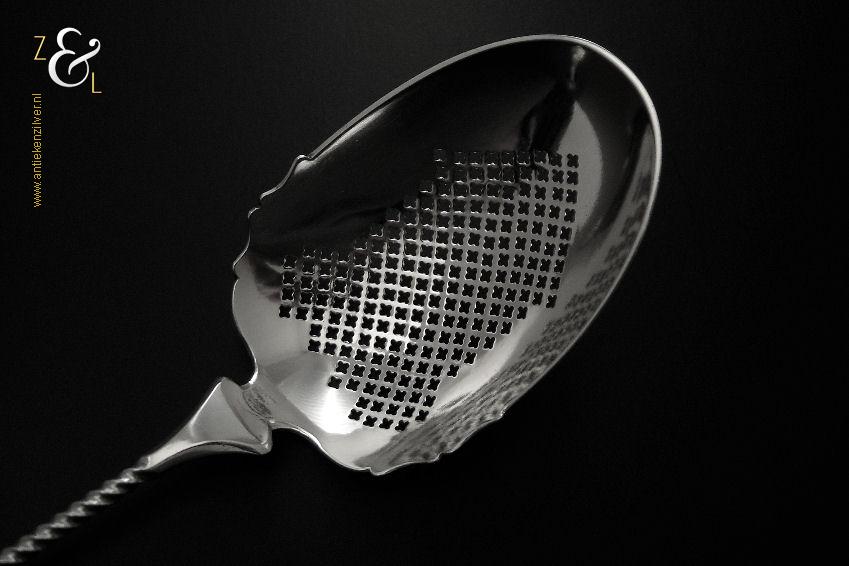 Deze natfruitlepel is gemaakt in Schoonhoven door Adrianus Andries Graves Kooiman (meesterteken A.G. boven K. in vierkant) in het jaar 1895 (jaarletter L). De royale zilveren Jugendstil natfruitlepel die een getordeerde steel heeft is uitgevoerd met een met plusjes uitgezaagde diepe lepelbak. Tevens heeft de natfruitlepel een hoekig in een punt uitlopend handvat die met parelrand is uitgevoerd. De natfruitlepel weegt 70 gram en is 24 cm lang. De lepelbak is 9.1 cm lang bij 6.2 cm breed.