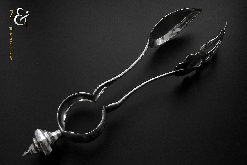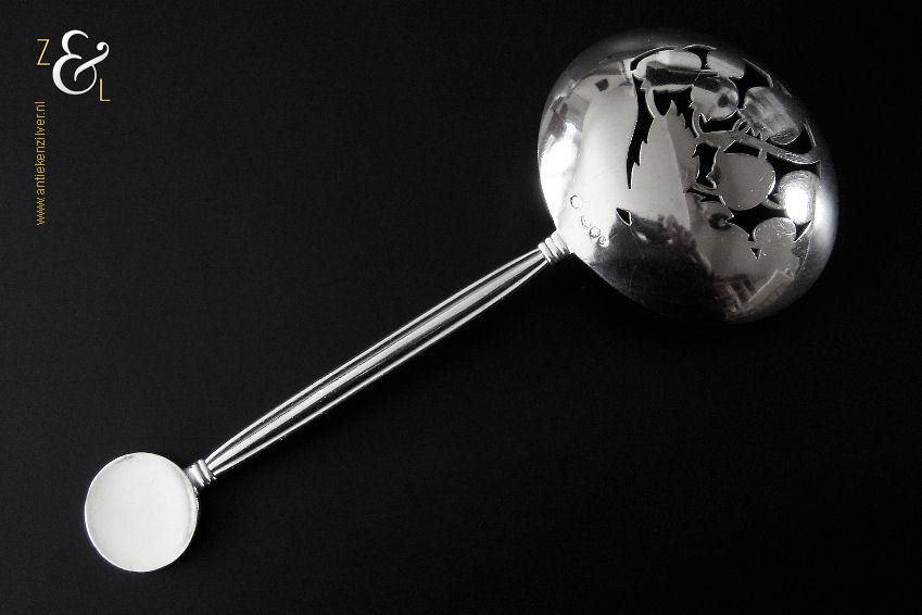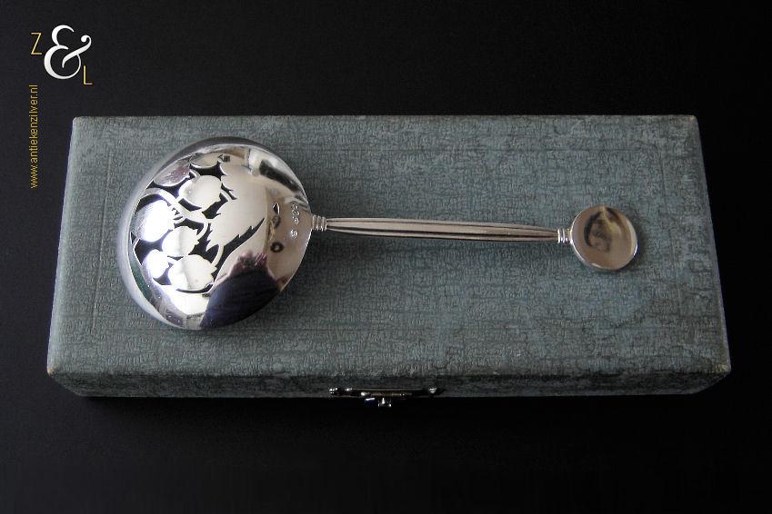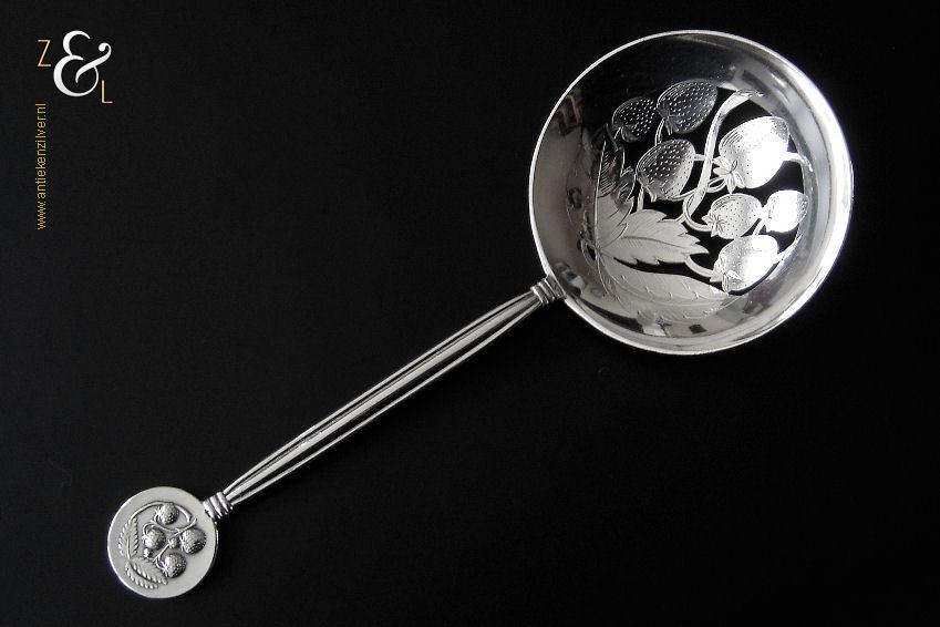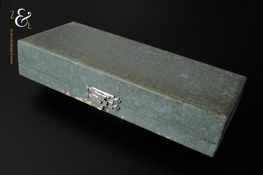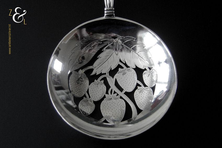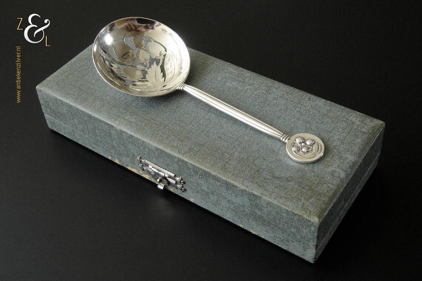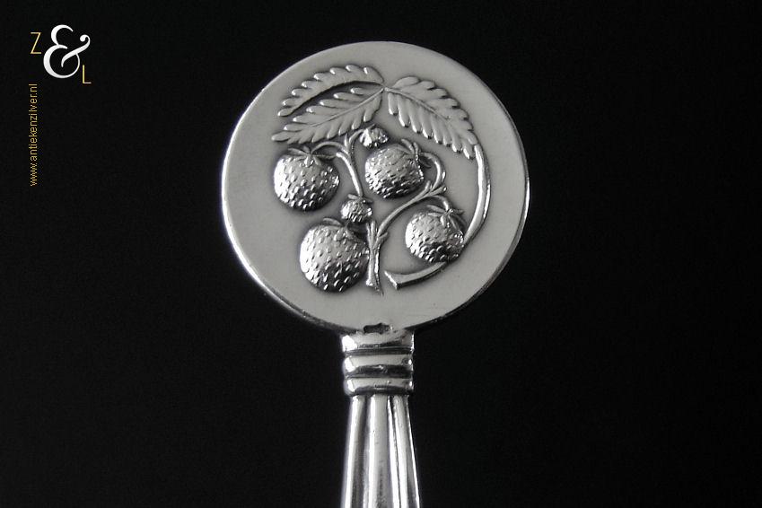 Deze natfruitlepel / aardbeienlepel model 600 naar het ontwerp van Gustav Beran is gemaakt in Zeist door Gerritsen & van Kempen N.V. (meesterteken V.K. in G) in het jaar 1933 (jaarletter Y). De zilveren natfruitlepel / aardbeienlepel waarvan de bak uitgezaagd en gegraveerd is met aardbeien en bladeren heeft een gestileerde steel waarvan het uiteinde bekroond is met een gegoten schijf met tevens aardbeien en bladeren. De zilveren natfruitlepel / aardbeienlepel heeft het originele blauwgrijze gemêleerde foedraal dat aan de binnenzijde een grijs zijden en vilten interieur heeft. Aan de binnenkant van het deksel is op een wit zijden lint gedrukt: Gebroeders Barends Goud & Zilverhandel* Raadhuisstraat 53 Amsterdam Telefoon 43557. Het foedraal heeft gebruiks- en slijtagesporen aan de voorzijde onder het slotje. De zilveren natfruitlepel / aardbeienlepel weegt 75 gram is 18.8 cm lang en heeft een bak met een diameter van 7.3 cm. Het foedraal is 24 cm lang bij 10 breed bij 4.5 cm hoog.
