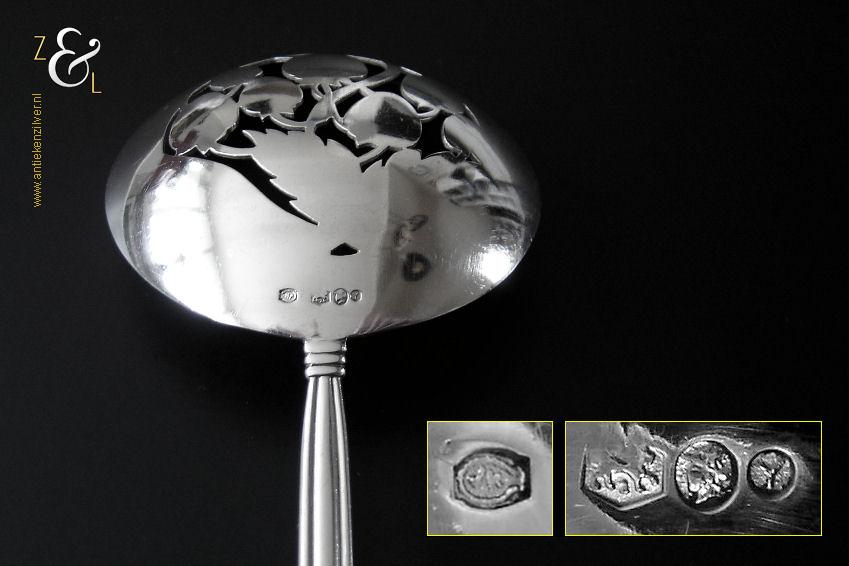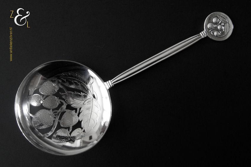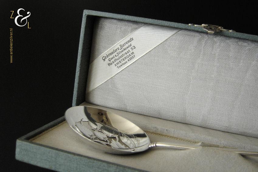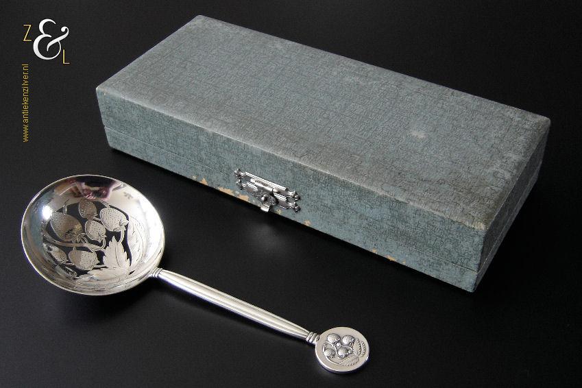 Deze natfruitlepel / aardbeienlepel model 600 naar het ontwerp van Gustav Beran is gemaakt in Zeist door Gerritsen & van Kempen N.V. (meesterteken V.K. in G) in het jaar 1933 (jaarletter Y). De zilveren natfruitlepel / aardbeienlepel waarvan de bak uitgezaagd en gegraveerd is met aardbeien en bladeren heeft een gestileerde steel waarvan het uiteinde bekroond is met een gegoten schijf met tevens aardbeien en bladeren. De zilveren natfruitlepel / aardbeienlepel heeft het originele blauwgrijze gemêleerde foedraal dat aan de binnenzijde een grijs zijden en vilten interieur heeft. Aan de binnenkant van het deksel is op een wit zijden lint gedrukt: Gebroeders Barends Goud & Zilverhandel* Raadhuisstraat 53 Amsterdam Telefoon 43557. Het foedraal heeft gebruiks- en slijtagesporen aan de voorzijde onder het slotje. De zilveren natfruitlepel / aardbeienlepel weegt 75 gram is 18.8 cm lang en heeft een bak met een diameter van 7.3 cm. Het foedraal is 24 cm lang bij 10 breed bij 4.5 cm hoog.