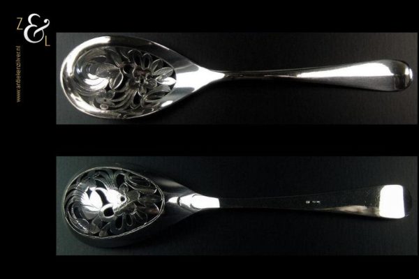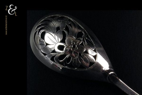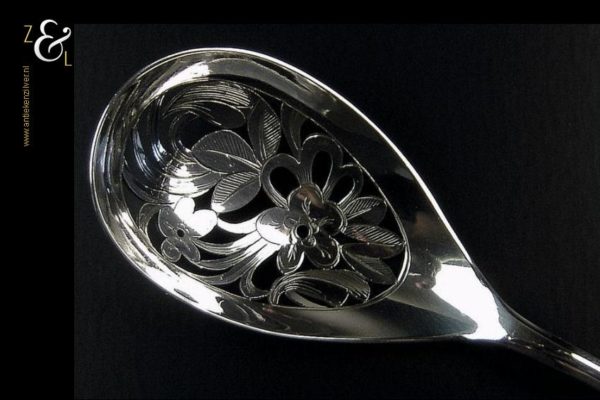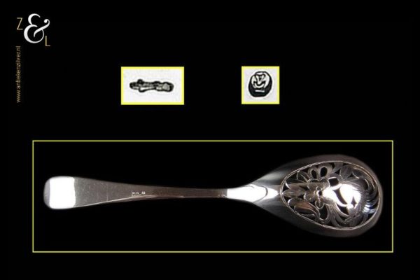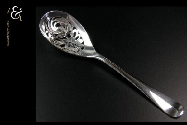 Natfruit- olijflepel met ajour gedeelte gezaagd naar het ontwerp van Christa Ehrlich. De natfruit- olijflepel is gemaakt in Voorschoten door de Zilverfabriek Voorschoten N.V. (meesterteken V boven liggend maantje in achthoek) tussen de jaren 1925 en 1953. Deze aan twee zijden gegraveerde in model 1060 uitgevoerde en met het zwaardje gekeurde zilveren natfruit- olijflepel weegt 29 gram en is 15.3 cm lang.