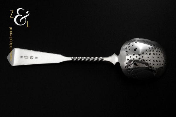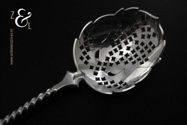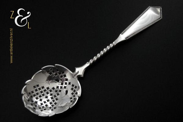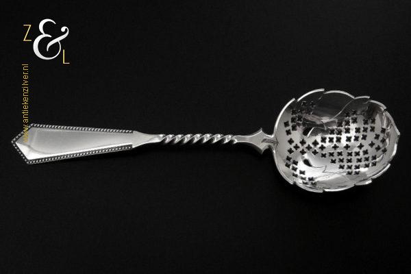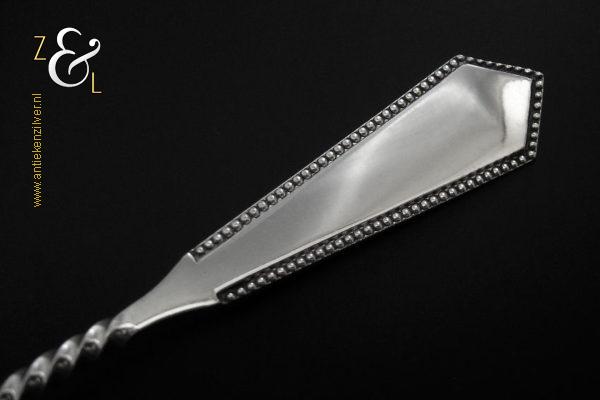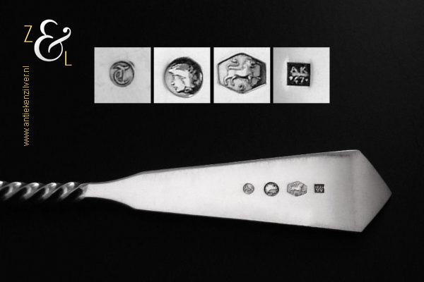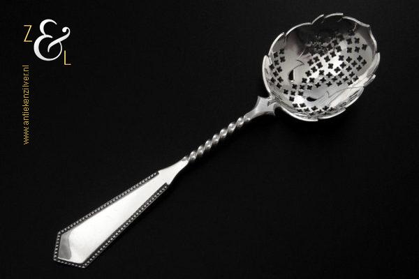 Deze natfruit- olijflepel is gemaakt in Schoonhoven door Jan Boon (meesterteken AK boven +47+ in vierkant) in het jaar 1903 (jaarletter T). De zilveren Art Deco natfruit- olijflepel heeft een getordeerde steel en een met plusjes uitgezaagde en gegraveerde lepelbak in bladvorm. Tevens heeft de natfruit- olijflepel een hoekig in een punt uitlopend handvat die met parelrand is uitgevoerd. De natfruit- olijflepel weegt 28 gram en is 15.3 cm lang. De lepelbak is 4.9 cm lang bij 4.1 cm breed.
