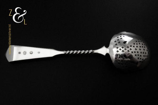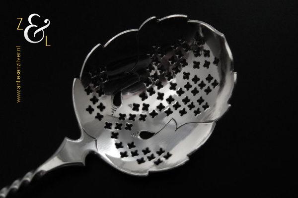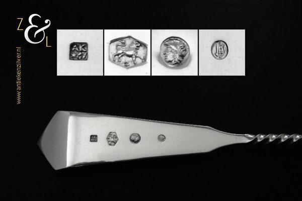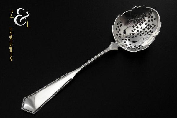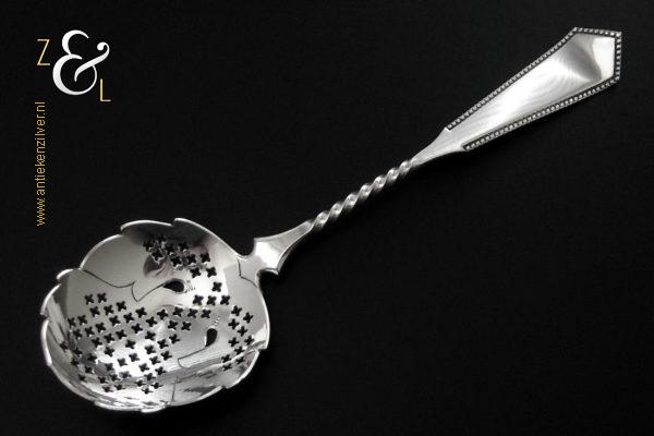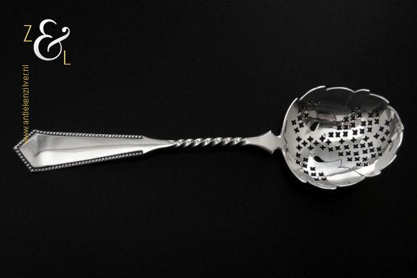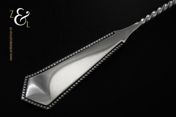 Deze natfruit- olijflepel is gemaakt in Schoonhoven door Adrianus Kuijlenburg Pz. (meesterteken AK boven * 47 in vierkant) in het jaar 1892 (jaarletter H). De zilveren Art Deco natfruit- olijflepel heeft een getordeerde steel en een met plusjes uitgezaagde en gegraveerde lepelbak in bladvorm. Tevens heeft de natfruit- olijflepel een hoekig in een punt uitlopend handvat die met parelrand is uitgevoerd. De natfruit- olijflepel weegt 22 gram en is 15.2 cm lang. De lepelbak is 4.8 cm lang bij 4.1 cm breed.