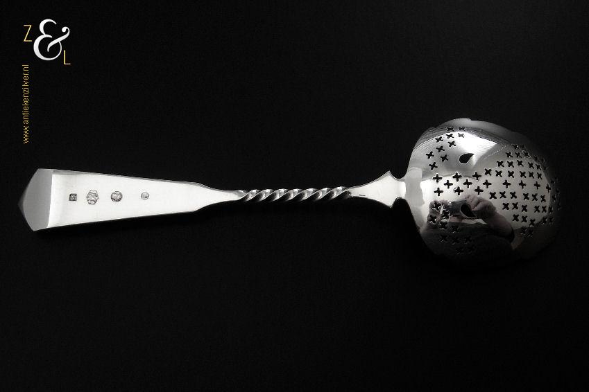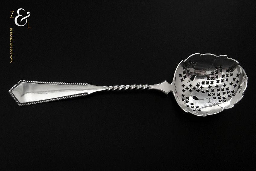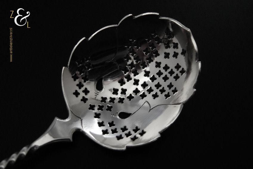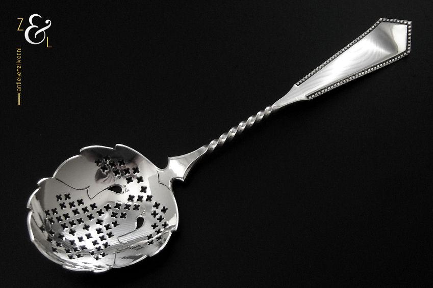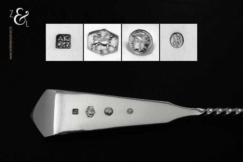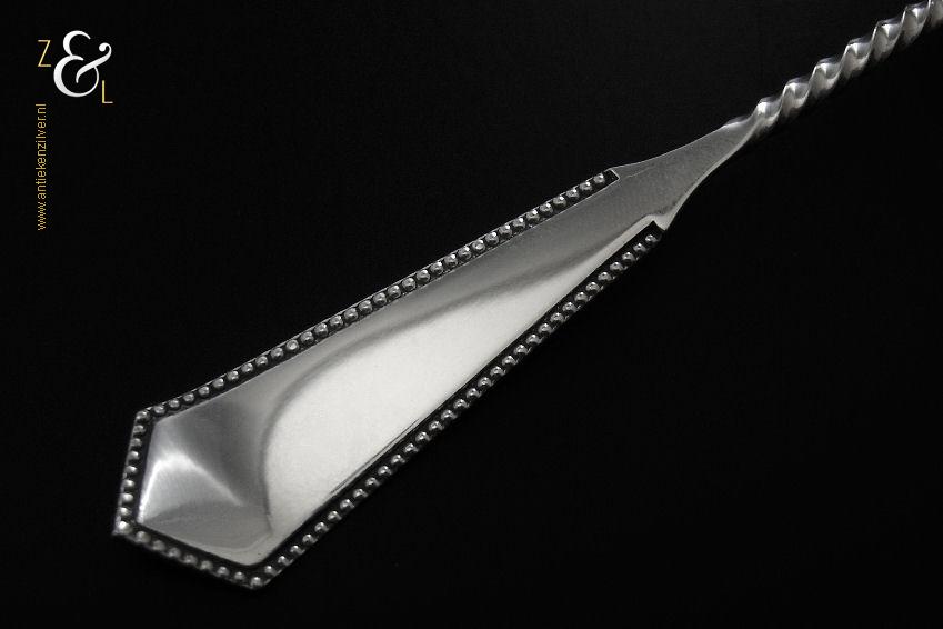 Deze natfruit- olijflepel is gemaakt in Schoonhoven door Adrianus Kuijlenburg Pz. (meesterteken AK boven * 47 in vierkant) in het jaar 1892 (jaarletter H). De zilveren Art Deco natfruit- olijflepel heeft een getordeerde steel en een met plusjes uitgezaagde en gegraveerde lepelbak in bladvorm. Tevens heeft de natfruit- olijflepel een hoekig in een punt uitlopend handvat die met parelrand is uitgevoerd. De natfruit- olijflepel weegt 22 gram en is 15.2 cm lang. De lepelbak is 4.8 cm lang bij 4.1 cm breed.