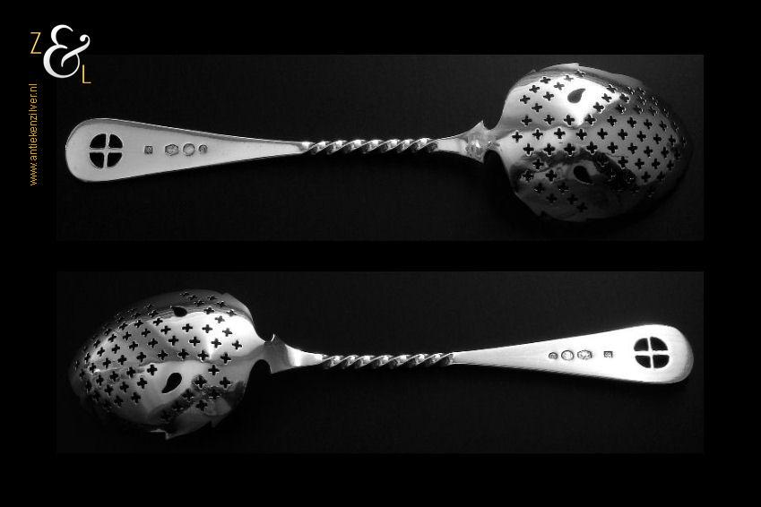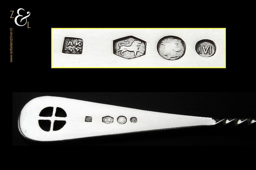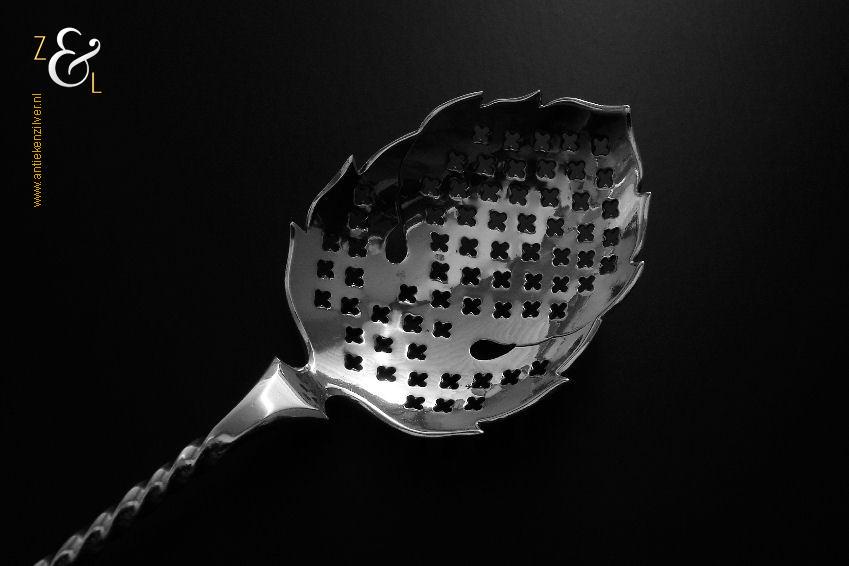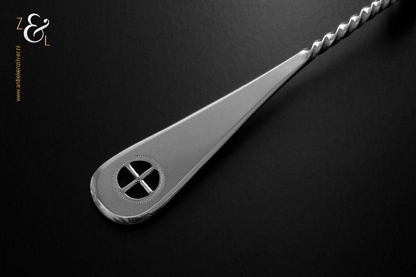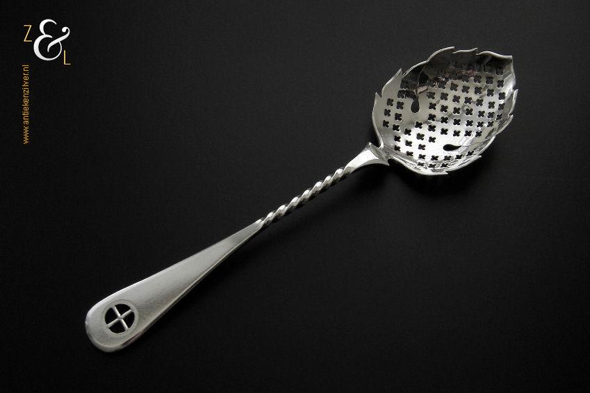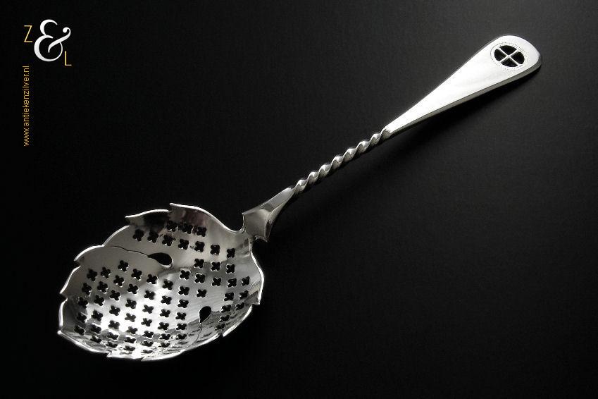 Natfruitlepel / suikerstrooilepel gemaakt in Schoonhoven door Jan Boon (meesterteken AK boven +47+ in vierkant) in het jaar 1922 (jaarletter M). Deze in Art Deco stijl uitgevoerde zilveren natfruitlepel / suikerstrooilepel heeft een met plusjes uitgezaagde lepelbak in bladvorm, getordeerde steel en een handvat met het uitgezaagde zonnerad het zogenaamde vier seizoenen symbool. De natfruitlepel / suikerstrooilepel weegt 30 gram en is 17.4 cm lang.