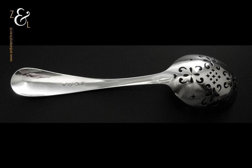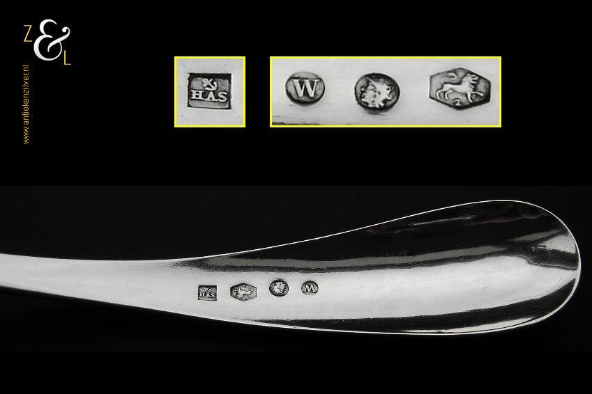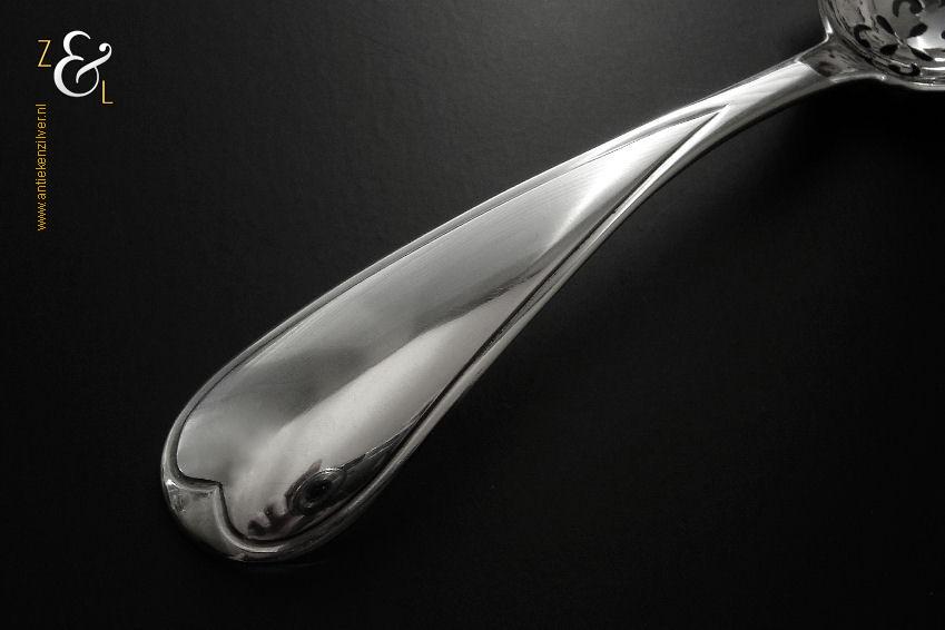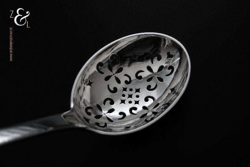 Natfruitlepel / suikerstrooilepel gemaakt in Amsterdam door H.A. Schuss (meesterteken HAS onder anker in vierkant) in het jaar 1856 (jaarletter W). Deze zilveren Biedermeier natfruitlepel / suikerstrooilepel is uitgevoerd in model hartfilet en heeft een fraai uitgezaagde lepelbak met harten, ruiten en gestileerde bloemmotieven. De natfruitlepel / suikerstrooilepel weegt 37 gram is 17.6 cm lang en heeft een bak van 6 cm bij 4.2 cm.