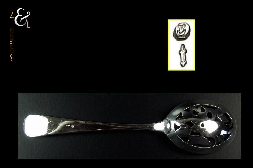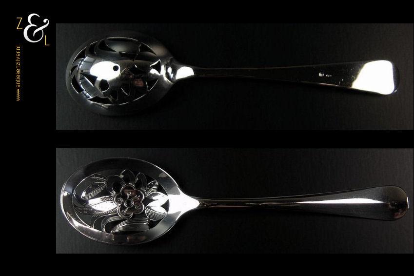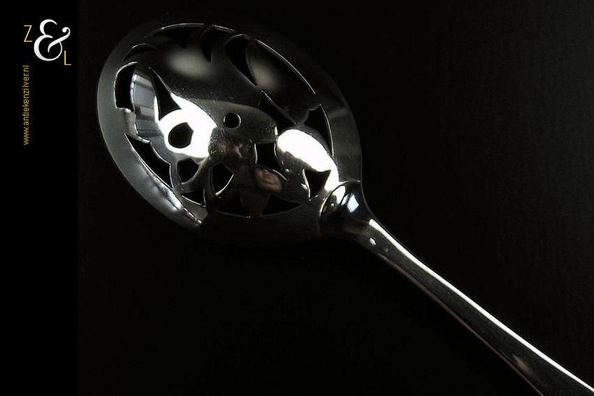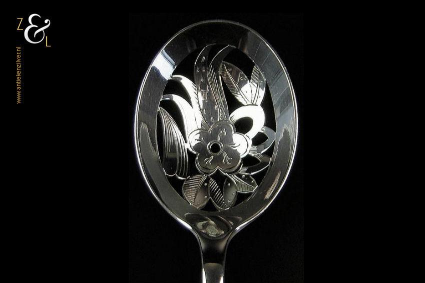 Olijflepel met ajour gedeelte gezaagd naar het ontwerp van Christa Ehrlich. De olijflepel is gemaakt in Voorschoten door de Zilverfabriek Voorschoten N.V. (meesterteken V boven liggend maantje in achthoek) tussen de jaren 1925 en 1953. Deze mooi gegraveerde en in model 1060 uitgevoerde en met het zwaardje gekeurde zilveren olijflepel weegt 25 gram en is 14.1 cm lang.