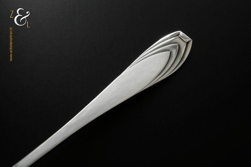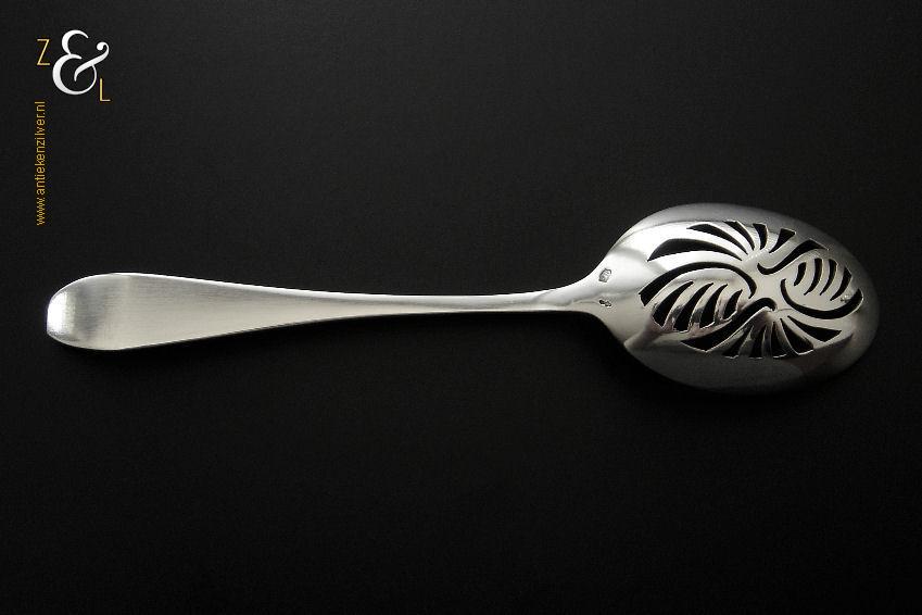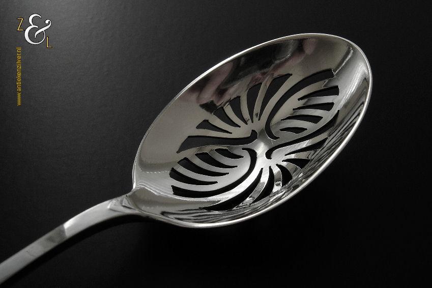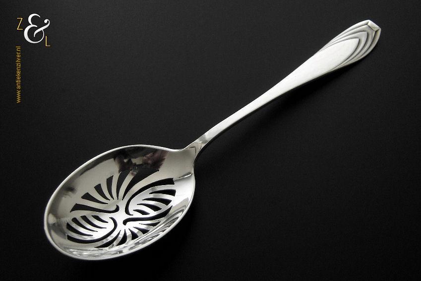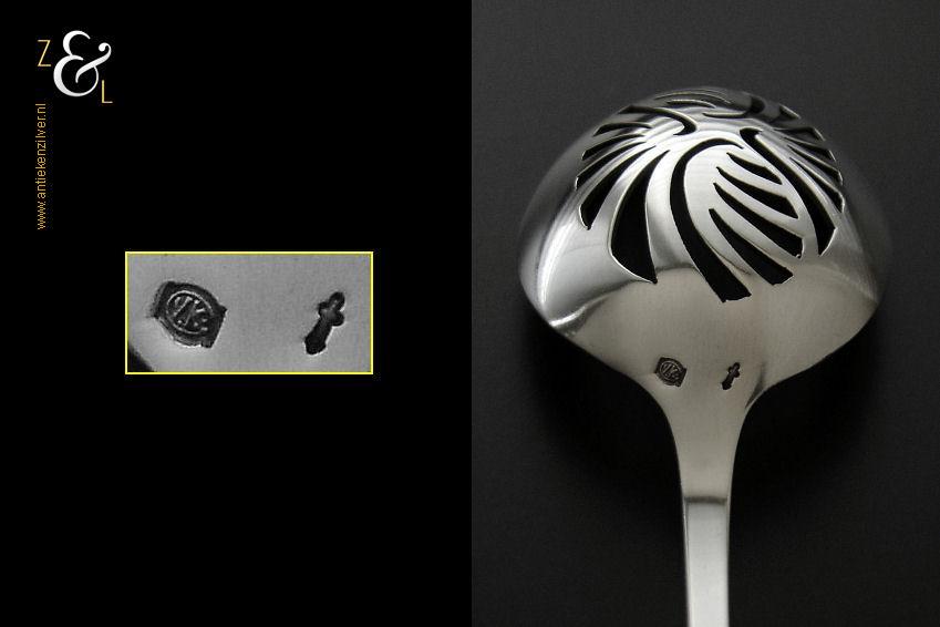 Olijflepel gemaakt in Zeist door Gerritsen & van Kempen N.V. (meesterteken V.K. in G) tussen 1926 en 1953 (gekeurd met het zilverkeur zwaardje). De gehamerde zilveren Art Deco olijflepel model 202 weegt 23 gram en is 13.8 cm lang. De bak is 4.8 cm lang bij 3.2 cm breed.