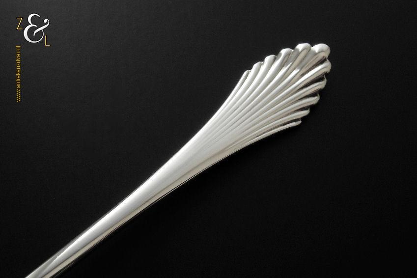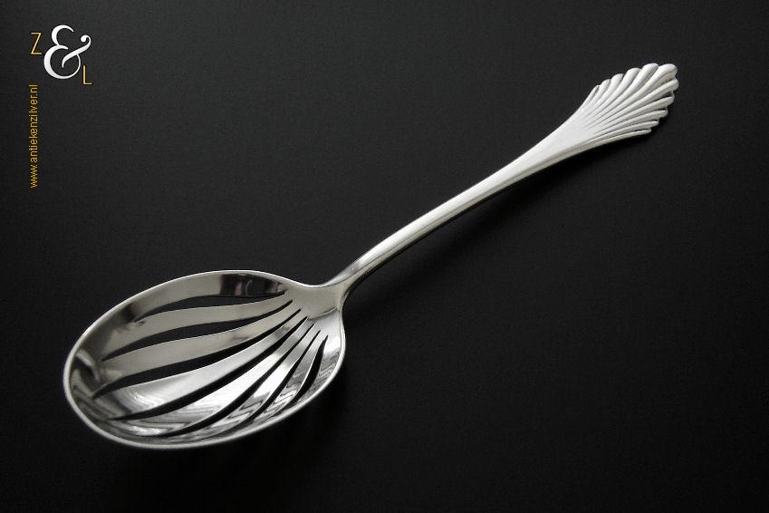 Olijflepel gemaakt in Zeist door Gerritsen & van Kempen N.V. (meesterteken V.K. in G) tussen 1926 en 1953 (gekeurd met het zilverkeur zwaardje). Deze in waaier / palmet uitgevoerde zilveren Art Deco olijflepel weegt 26 gram en is 14.3 cm lang. De bak is 4.9 cm lang bij 3.2 cm breed.