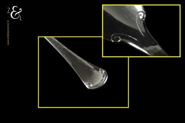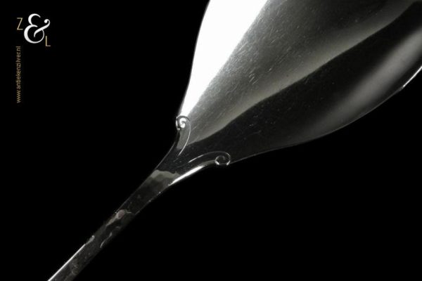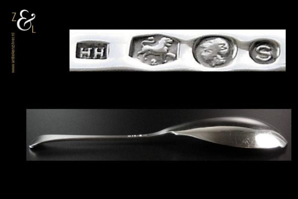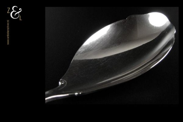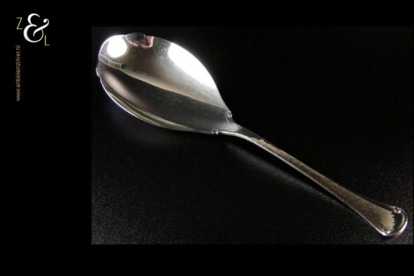 Deze rijstlepel is gemaakt in Delft door H. Hinne (meesterteken HH in rechthoek) in het jaar 1928 (jaarletter S). De zilveren Art Deco rijstlepel heeft een gehamerde steel en een sierlijk gevormd schepgedeelte. De rijstlepel weegt 84 gram en is 22.8 cm lang. De lepelbak is 10 cm lang bij 6.9 cm breed.