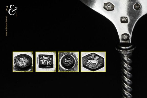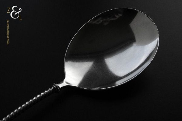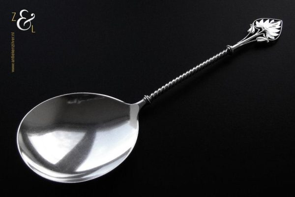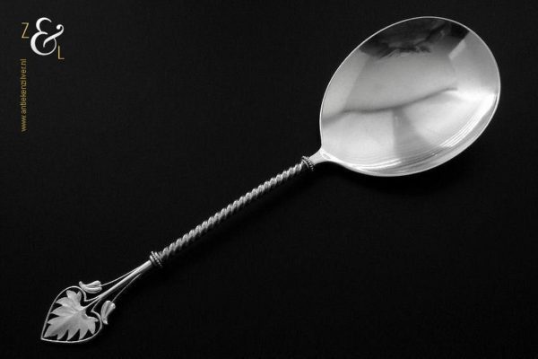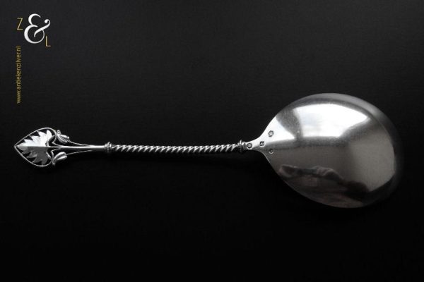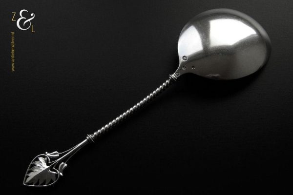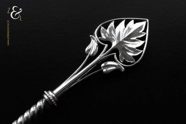Deze rijstlepel is gemaakt in Voorschoten door de Firma J.M. van Kempen & Zonen (meesterteken liggend maantje tussen punten boven VK in vierkant) in het jaar 1902 (jaarletter S). De zilveren Art Nouveau rijstlepel heeft een gegoten getordeerde steel en handvat. Het handvat heeft de vorm van een gestileerd blad. De rijstlepel weegt 85 gram en is 23.2 cm lang. De lepelbak is 9 cm lang bij 7 cm breed.