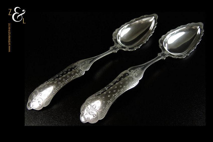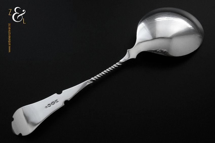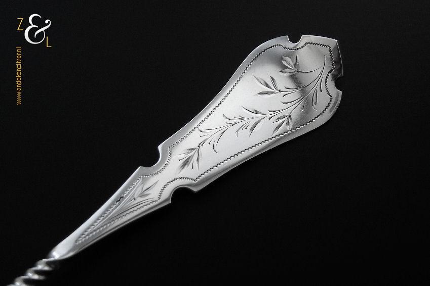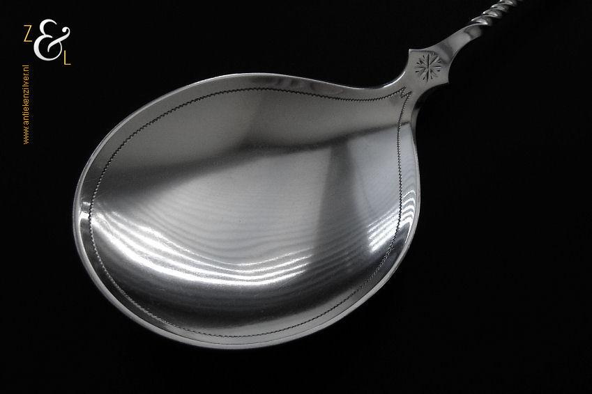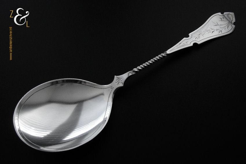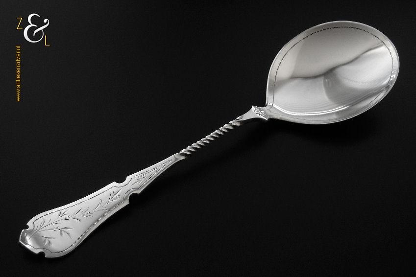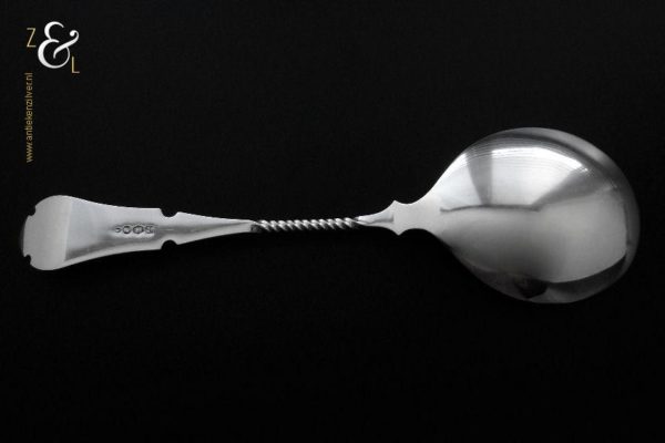 Deze rijstlepel is gemaakt in Voorschoten door de Firma J.M. van Kempen & Zonen (meesterteken liggend maantje tussen punten boven VK in vierkant) in het jaar 1892 (jaarletter H). De zilveren Jugendstil rijstlepel heeft een getordeerde steel en een fijntjes gegraveerd handvat. De rijstlepel weegt 85 gram en is 23.3 cm lang. De lepelbak is 8.5 cm lang bij 6.7 cm breed.